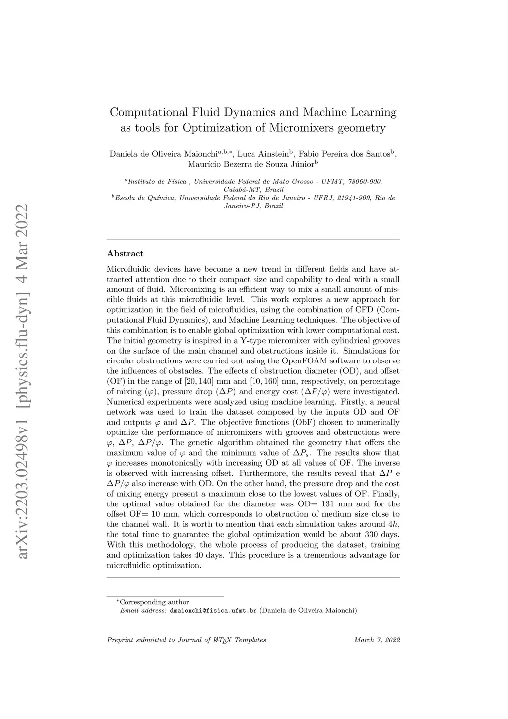 This work explores a new approach for optimization in the field of microfluidics, using the combination of CFD (Computational Fluid Dynamics), and Machine Learning techniques. The objective of this combination is to enable global optimization with lower computational cost. The initial geometry is inspired in a Y-type micromixer with cylindrical grooves on the surface of the main channel and obstructions inside it. Simulations for circular obstructions were carried out using the OpenFOAM software to observe the influences of obstacles. The effects of obstruction diameter (OD), and offset (OF) in the range of [20,140] mm and [10,160] mm, respectively, on percentage of mixing (), pressure drop () and energy cost () were investigated. Numerical experiments were analyzed using machine learning. Firstly, a neural network was used to train the dataset composed by the inputs OD and OF and outputs and . The objective functions (ObF) chosen to numerically optimize the performance of micromixers with grooves and obstructions were , , . The genetic algorithm obtained the geometry that offers the maximum value of and the minimum value of . The results show that increases monotonically with increasing OD at all values of OF. The inverse is observed with increasing offset. Furthermore, the results reveal that e also increase with OD. On the other hand, the pressure drop and the cost of mixing energy present a maximum close to the lowest values of OF. Finally, the optimal value obtained for the diameter was OD=131 mm and for the offset OF=10 mm, which corresponds to obstruction of medium size close to the channel wall.