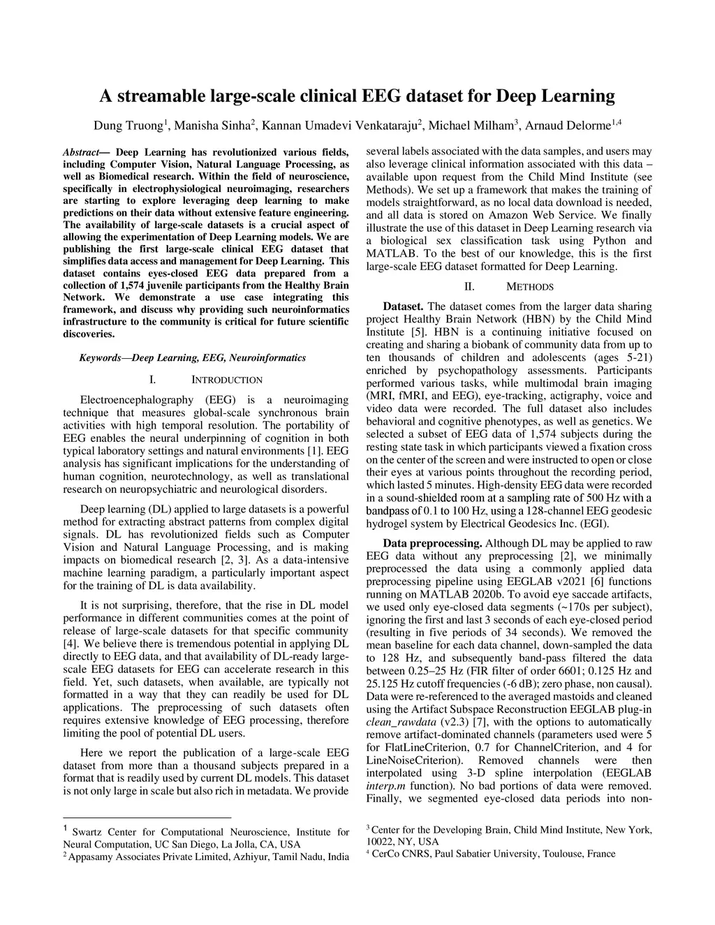 Deep Learning has revolutionized various fields, including Computer Vision, Natural Language Processing, as well as Biomedical research. Within the field of neuroscience, specifically in electrophysiological neuroimaging, researchers are starting to explore leveraging deep learning to make predictions on their data without extensive feature engineering. The availability of large-scale datasets is a crucial aspect of allowing the experimentation of Deep Learning models. We are publishing the first large-scale clinical EEG dataset that simplifies data access and management for Deep Learning. This dataset contains eyes-closed EEG data prepared from a collection of 1,574 juvenile participants from the Healthy Brain Network. We demonstrate a use case integrating this framework, and discuss why providing such neuroinformatics infrastructure to the community is critical for future scientific discoveries.