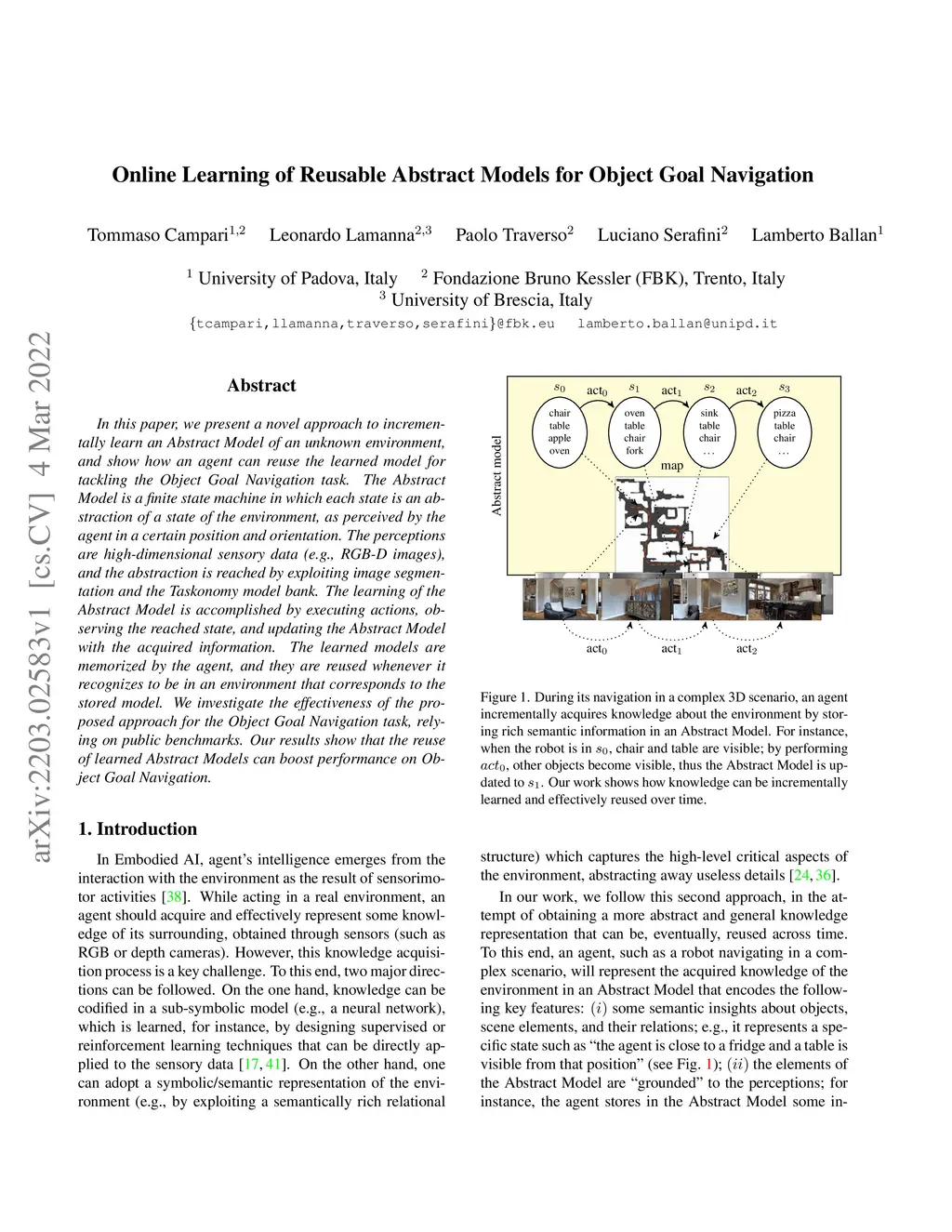 In this paper, we present a novel approach to incrementally learn an Abstract Model of an unknown environment, and show how an agent can reuse the learned model for tackling the Object Goal Navigation task. The Abstract Model is a finite state machine in which each state is an abstraction of a state of the environment, as perceived by the agent in a certain position and orientation. The perceptions are high-dimensional sensory data (e.g., RGB-D images), and the abstraction is reached by exploiting image segmentation and the Taskonomy model bank. The learning of the Abstract Model is accomplished by executing actions, observing the reached state, and updating the Abstract Model with the acquired information. The learned models are memorized by the agent, and they are reused whenever it recognizes to be in an environment that corresponds to the stored model. We investigate the effectiveness of the proposed approach for the Object Goal Navigation task, relying on public benchmarks. Our results show that the reuse of learned Abstract Models can boost performance on Object Goal Navigation.