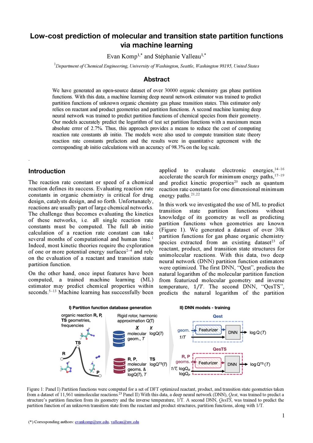 We have generated an open-source dataset of over 30000 organic chemistry gas phase partition functions. With this data, a machine learning deep neural network estimator was trained to predict partition functions of unknown organic chemistry gas phase transition states. This estimator only relies on reactant and product geometries and partition functions. A second machine learning deep neural network was trained to predict partition functions of chemical species from their geometry. Our models accurately predict the logarithm of test set partition functions with a maximum mean absolute error of 2.7%. Thus, this approach provides a means to reduce the cost of computing reaction rate constants ab initio. The models were also used to compute transition state theory reaction rate constants prefactors and the results were in quantitative agreement with the corresponding ab initio calculations with an accuracy of 98.3% on the log scale.