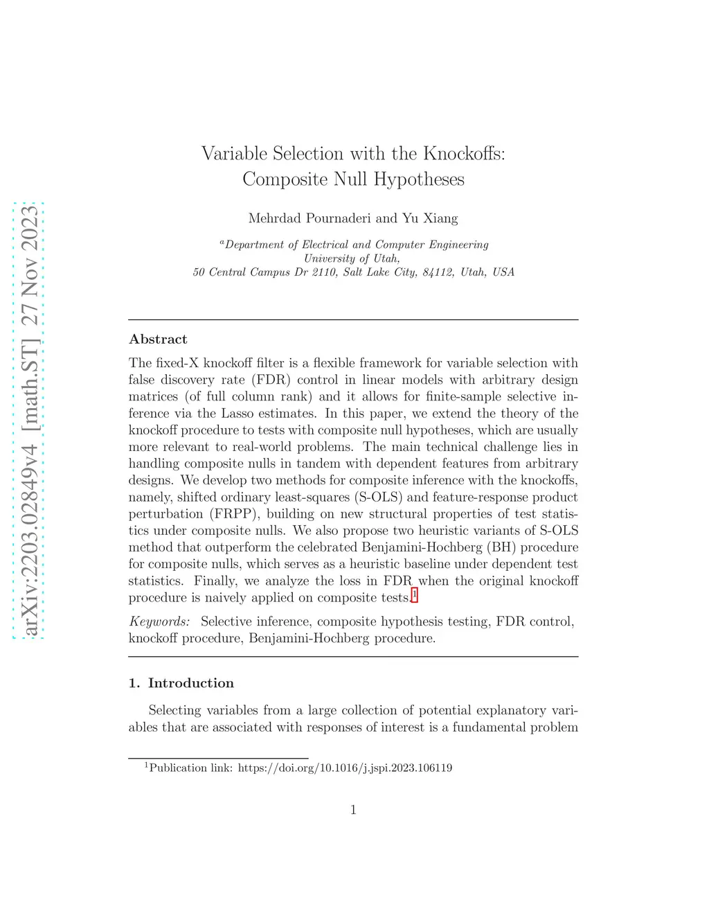Variable Selection with the Knockoffs: Composite Null Hypotheses