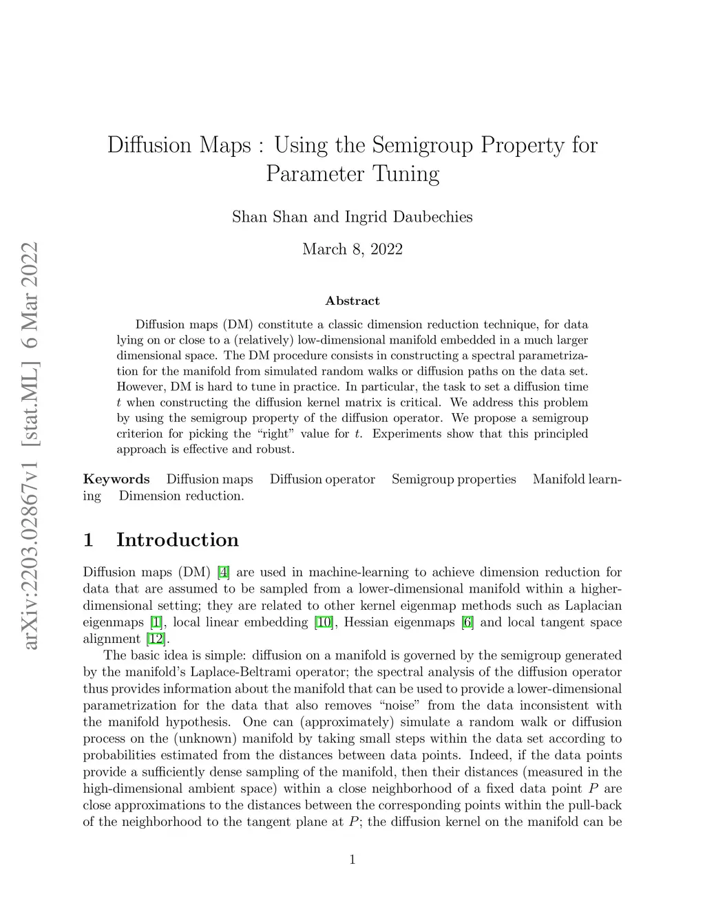 Diffusion maps (DM) constitute a classic dimension reduction technique, for data lying on or close to a (relatively) low-dimensional manifold embedded in a much larger dimensional space. The DM procedure consists in constructing a spectral parametrization for the manifold from simulated random walks or diffusion paths on the data set. However, DM is hard to tune in practice. In particular, the task to set a diffusion time t when constructing the diffusion kernel matrix is critical. We address this problem by using the semigroup property of the diffusion operator. We propose a semigroup criterion for picking t. Experiments show that this principled approach is effective and robust.