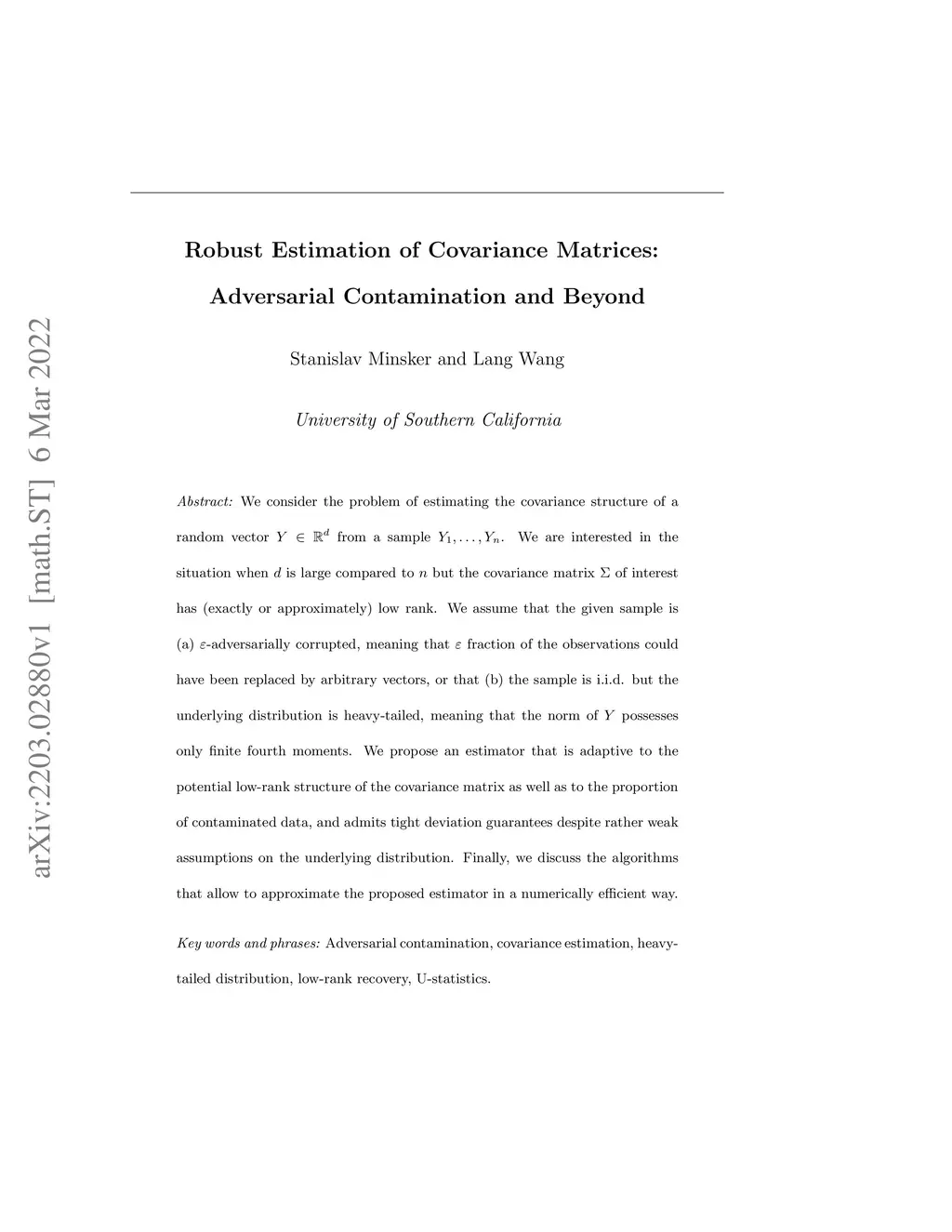 We consider the problem of estimating the covariance structure of a random vector from a sample . We are interested in the situation when is large compared to but the covariance matrix of interest has (exactly or approximately) low rank. We assume that the given sample is (a) -adversarially corrupted, meaning that fraction of the observations could have been replaced by arbitrary vectors, or that (b) the sample is i.i.d. but the underlying distribution is heavy-tailed, meaning that the norm of possesses only finite fourth moments. We propose an estimator that is adaptive to the potential low-rank structure of the covariance matrix as well as to the proportion of contaminated data, and admits tight deviation guarantees despite rather weak assumptions on the underlying distribution. Finally, we discuss the algorithms that allow to approximate the proposed estimator in a numerically efficient way.