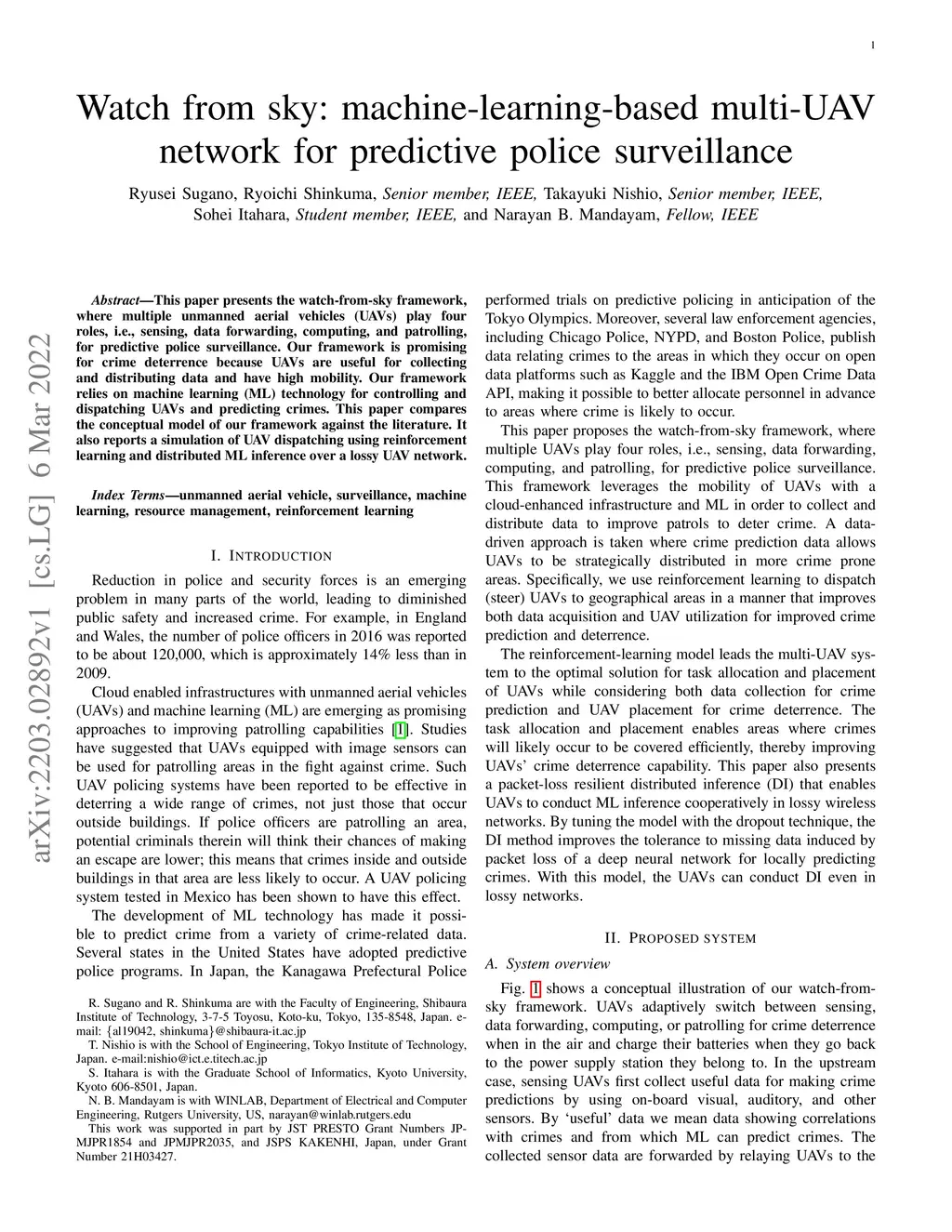 This paper presents the watch-from-sky framework, where multiple unmanned aerial vehicles (UAVs) play four roles, i.e., sensing, data forwarding, computing, and patrolling, for predictive police surveillance. Our framework is promising for crime deterrence because UAVs are useful for collecting and distributing data and have high mobility. Our framework relies on machine learning (ML) technology for controlling and dispatching UAVs and predicting crimes. This paper compares the conceptual model of our framework against the literature. It also reports a simulation of UAV dispatching using reinforcement learning and distributed ML inference over a lossy UAV network.