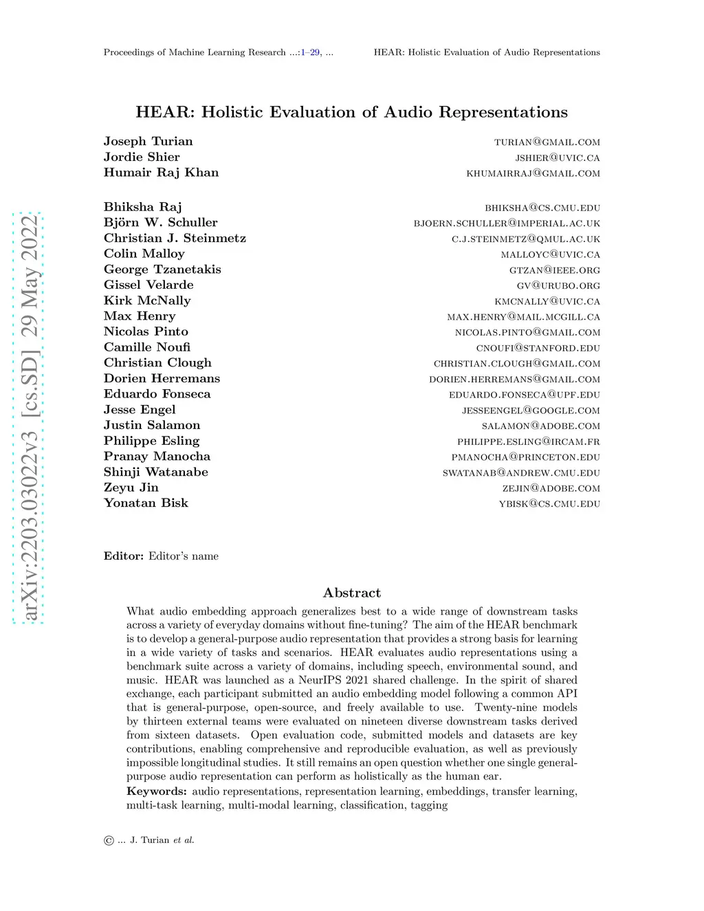 What audio embedding approach generalizes best to a wide range of downstream tasks across a variety of everyday domains without fine-tuning? The aim of the HEAR benchmark is to develop a general-purpose audio representation that provides a strong basis for learning in a wide variety of tasks and scenarios. HEAR evaluates audio representations using a benchmark suite across a variety of domains, including speech, environmental sound, and music. HEAR was launched as a NeurIPS 2021 shared challenge. In the spirit of shared exchange, each participant submitted an audio embedding model following a common API that is general-purpose, open-source, and freely available to use. Twenty-nine models by thirteen external teams were evaluated on nineteen diverse downstream tasks derived from sixteen datasets. Open evaluation code, submitted models and datasets are key contributions, enabling comprehensive and reproducible evaluation, as well as previously impossible longitudinal studies. It still remains an open question whether one single general-purpose audio representation can perform as holistically as the human ear.