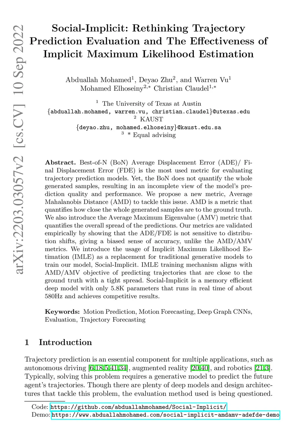 Best-of-N (BoN) Average Displacement Error (ADE)/ Final Displacement Error (FDE) is the most used metric for evaluating trajectory prediction models. Yet, the BoN does not quantify the whole generated samples, resulting in an incomplete view of the model's prediction quality and performance. We propose a new metric, Average Mahalanobis Distance (AMD) to tackle this issue. AMD is a metric that quantifies how close the whole generated samples are to the ground truth. We also introduce the Average Maximum Eigenvalue (AMV) metric that quantifies the overall spread of the predictions. Our metrics are validated empirically by showing that the ADE/FDE is not sensitive to distribution shifts, giving a biased sense of accuracy, unlike the AMD/AMV metrics. We introduce the usage of Implicit Maximum Likelihood Estimation (IMLE) as a replacement for traditional generative models to train our model, Social-Implicit. IMLE training mechanism aligns with AMD/AMV objective of predicting trajectories that are close to the ground truth with a tight spread. Social-Implicit is a memory efficient deep model with only 5.8K parameters that runs in real time of about 580Hz and achieves competitive results. Interactive demo of the problem can be seen at https://www.abduallahmohamed.com/social-implicit-amdamv-adefde-demo . Code is available at https://github.com/abduallahmohamed/Social-Implicit .