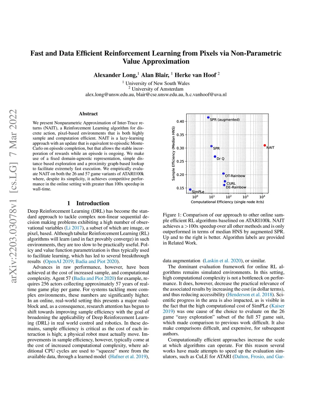 We present Nonparametric Approximation of Inter-Trace returns (NAIT), a Reinforcement Learning algorithm for discrete action, pixel-based environments that is both highly sample and computation efficient. NAIT is a lazy-learning approach with an update that is equivalent to episodic Monte-Carlo on episode completion, but that allows the stable incorporation of rewards while an episode is ongoing. We make use of a fixed domain-agnostic representation, simple distance based exploration and a proximity graph-based lookup to facilitate extremely fast execution. We empirically evaluate NAIT on both the 26 and 57 game variants of ATARI100k where, despite its simplicity, it achieves competitive performance in the online setting with greater than 100x speedup in wall-time.