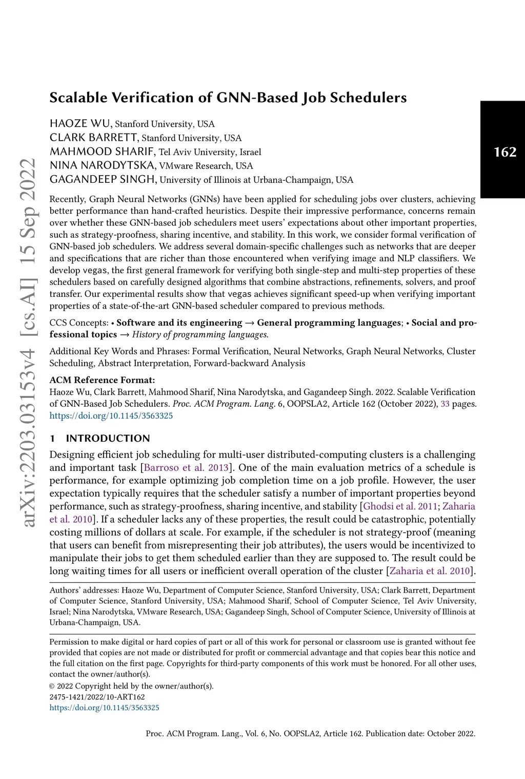 Recently, Graph Neural Networks (GNNs) have been applied for scheduling jobs over clusters, achieving better performance than hand-crafted heuristics. Despite their impressive performance, concerns remain over whether these GNN-based job schedulers meet users' expectations about other important properties, such as strategy-proofness, sharing incentive, and stability. In this work, we consider formal verification of GNN-based job schedulers. We address several domain-specific challenges such as networks that are deeper and specifications that are richer than those encountered when verifying image and NLP classifiers. We develop vegas, the first general framework for verifying both single-step and multi-step properties of these schedulers based on carefully designed algorithms that combine abstractions, refinements, solvers, and proof transfer. Our experimental results show that vegas achieves significant speed-up when verifying important properties of a state-of-the-art GNN-based scheduler compared to previous methods.