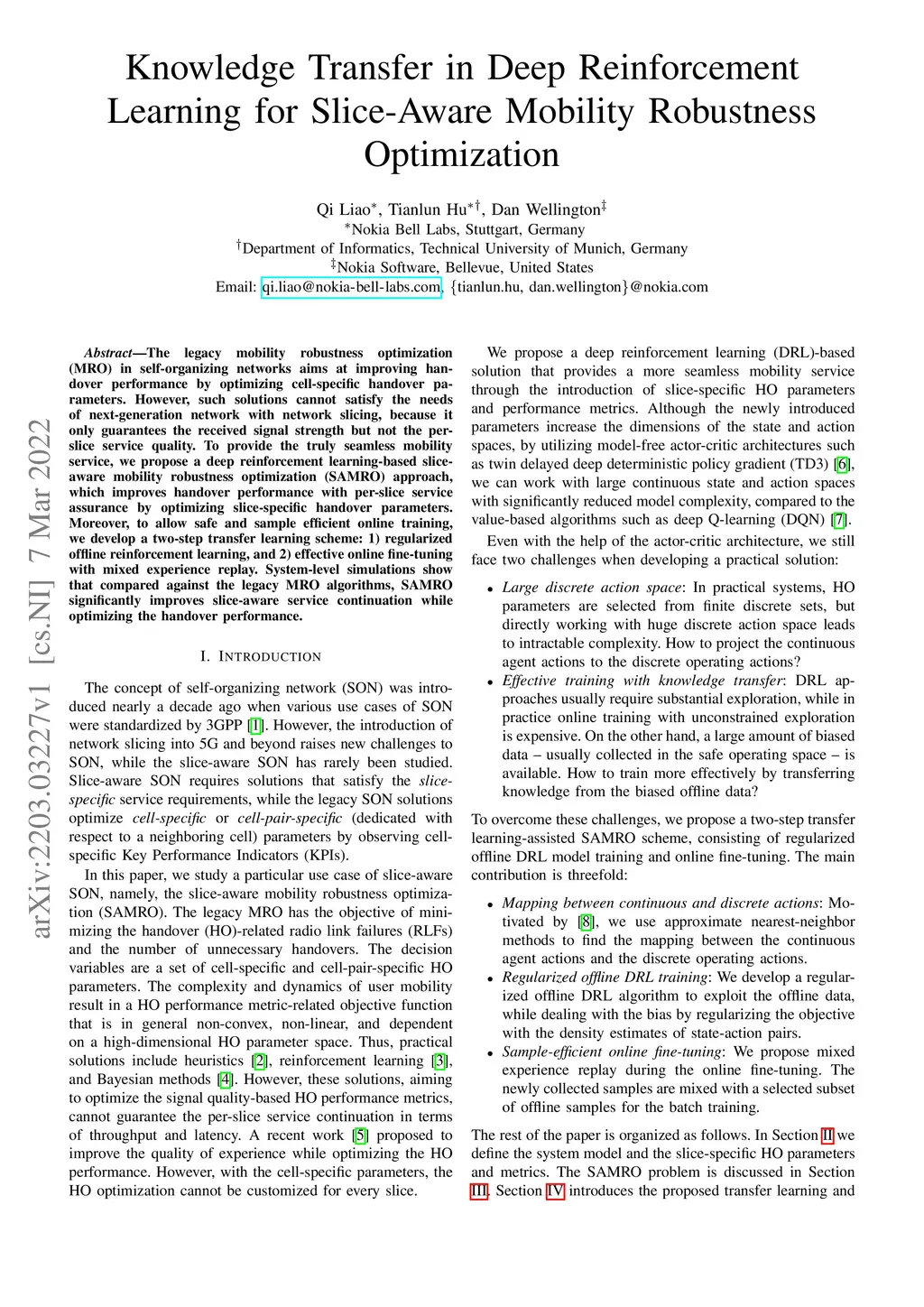 The legacy mobility robustness optimization (MRO) in self-organizing networks aims at improving handover performance by optimizing cell-specific handover parameters. However, such solutions cannot satisfy the needs of next-generation network with network slicing, because it only guarantees the received signal strength but not the per-slice service quality. To provide the truly seamless mobility service, we propose a deep reinforcement learning-based slice-aware mobility robustness optimization (SAMRO) approach, which improves handover performance with per-slice service assurance by optimizing slice-specific handover parameters. Moreover, to allow safe and sample efficient online training, we develop a two-step transfer learning scheme: 1) regularized offline reinforcement learning, and 2) effective online fine-tuning with mixed experience replay. System-level simulations show that compared against the legacy MRO algorithms, SAMRO significantly improves slice-aware service continuation while optimizing the handover performance.