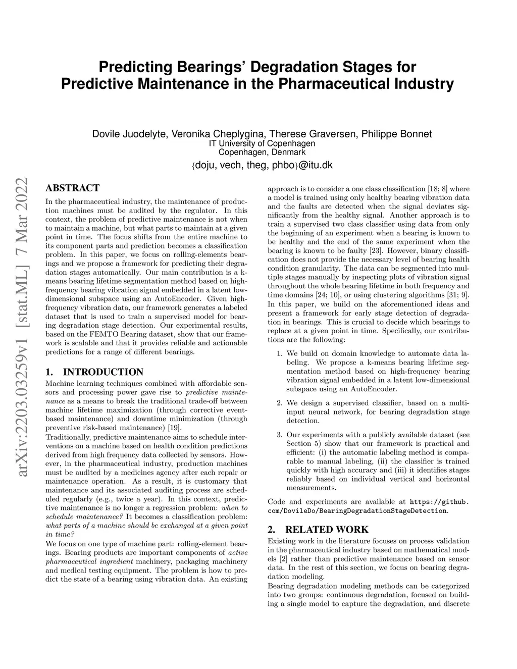 In the pharmaceutical industry, the maintenance of production machines must be audited by the regulator. In this context, the problem of predictive maintenance is not when to maintain a machine, but what parts to maintain at a given point in time. The focus shifts from the entire machine to its component parts and prediction becomes a classification problem. In this paper, we focus on rolling-elements bearings and we propose a framework for predicting their degradation stages automatically. Our main contribution is a k-means bearing lifetime segmentation method based on high-frequency bearing vibration signal embedded in a latent low-dimensional subspace using an AutoEncoder. Given high-frequency vibration data, our framework generates a labeled dataset that is used to train a supervised model for bearing degradation stage detection. Our experimental results, based on the FEMTO Bearing dataset, show that our framework is scalable and that it provides reliable and actionable predictions for a range of different bearings.