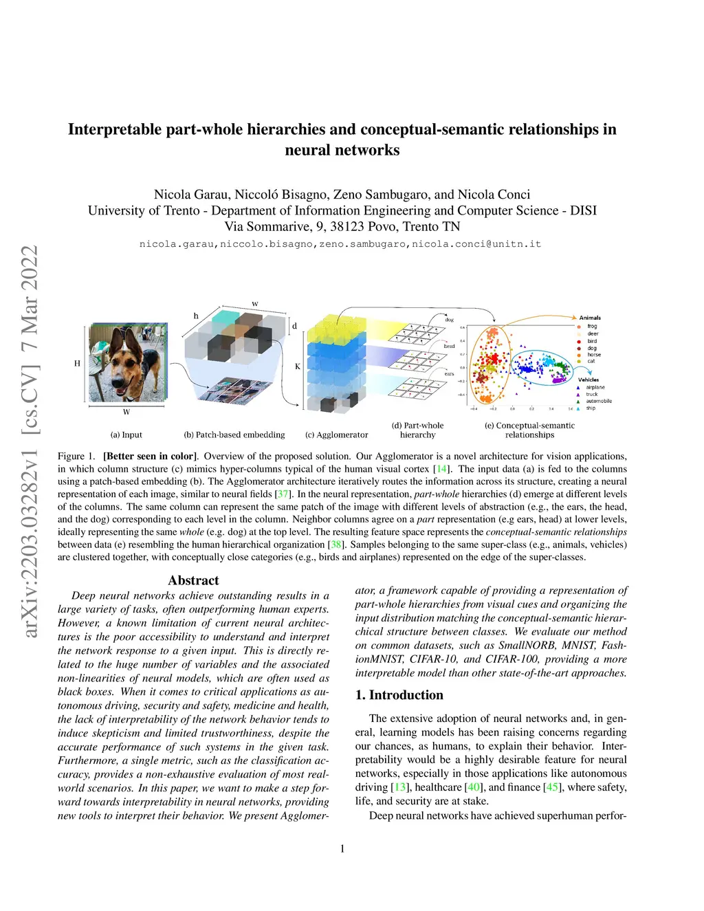Deep neural networks achieve outstanding results in a large variety of tasks, often outperforming human experts. However, a known limitation of current neural architectures is the poor accessibility to understand and interpret the network response to a given input. This is directly related to the huge number of variables and the associated non-linearities of neural models, which are often used as black boxes. When it comes to critical applications as autonomous driving, security and safety, medicine and health, the lack of interpretability of the network behavior tends to induce skepticism and limited trustworthiness, despite the accurate performance of such systems in the given task. Furthermore, a single metric, such as the classification accuracy, provides a non-exhaustive evaluation of most real-world scenarios. In this paper, we want to make a step forward towards interpretability in neural networks, providing new tools to interpret their behavior. We present Agglomerator, a framework capable of providing a representation of part-whole hierarchies from visual cues and organizing the input distribution matching the conceptual-semantic hierarchical structure between classes. We evaluate our method on common datasets, such as SmallNORB, MNIST, FashionMNIST, CIFAR-10, and CIFAR-100, providing a more interpretable model than other state-of-the-art approaches.