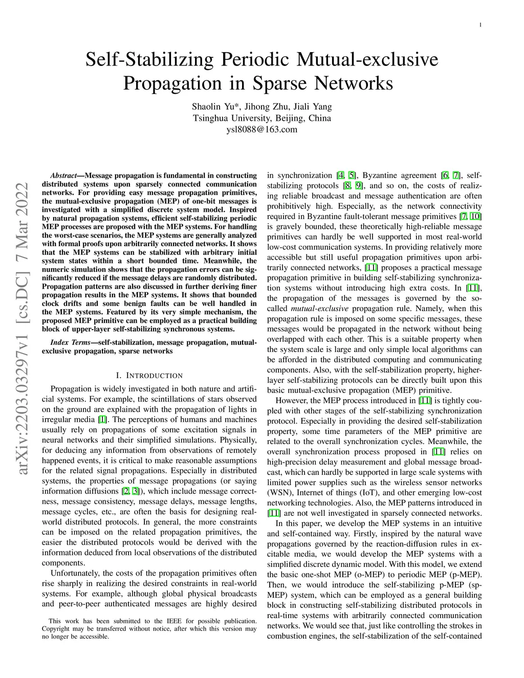 Message propagation is fundamental in constructing distributed systems upon sparsely connected communication networks. For providing easy message propagation primitives, the mutual-exclusive propagation (MEP) of one-bit messages is investigated with a simplified discrete system model. Inspired by natural propagation systems, efficient self-stabilizing periodic MEP processes are proposed with the MEP systems. For handling the worst-case scenarios, the MEP systems are generally analyzed with formal proofs upon arbitrarily connected networks. It shows that the MEP systems can be stabilized with arbitrary initial system states within a short bounded time. Meanwhile, the numeric simulation shows that the propagation errors can be significantly reduced if the message delays are randomly distributed. Propagation patterns are also discussed in further deriving finer propagation results in the MEP systems. It shows that bounded clock drifts and some benign faults can be well handled in the MEP systems. Featured by its very simple mechanism, the proposed MEP primitive can be employed as a practical building block of upper-layer self-stabilizing synchronous systems.