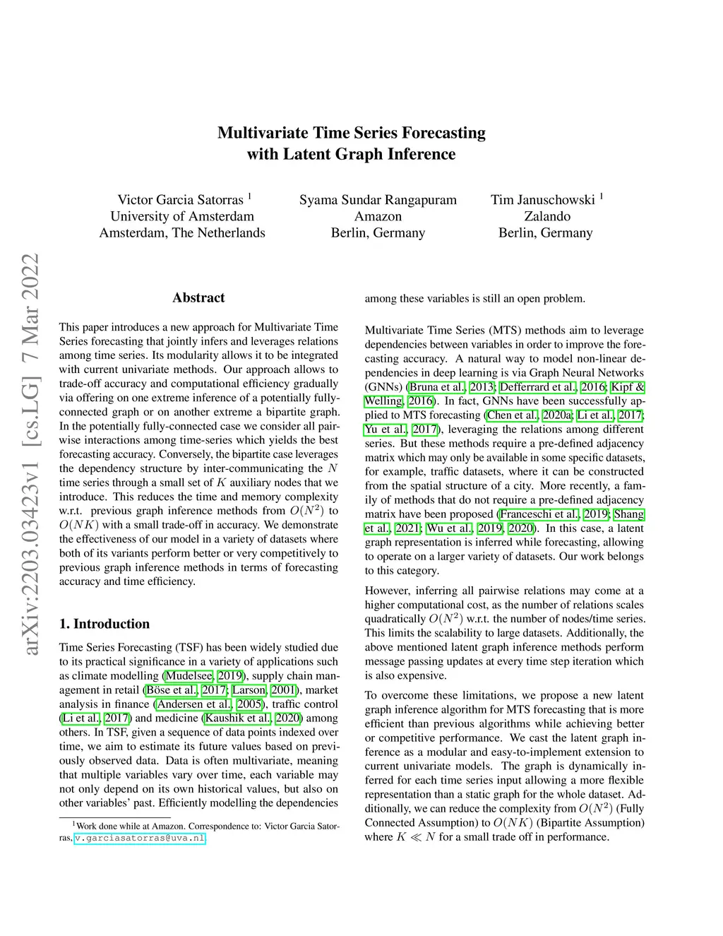 This paper introduces a new approach for Multivariate Time Series forecasting that jointly infers and leverages relations among time series. Its modularity allows it to be integrated with current univariate methods. Our approach allows to trade-off accuracy and computational efficiency gradually via offering on one extreme inference of a potentially fully-connected graph or on another extreme a bipartite graph. In the potentially fully-connected case we consider all pair-wise interactions among time-series which yields the best forecasting accuracy. Conversely, the bipartite case leverages the dependency structure by inter-communicating the N time series through a small set of K auxiliary nodes that we introduce. This reduces the time and memory complexity w.r.t. previous graph inference methods from O(N^2) to O(NK) with a small trade-off in accuracy. We demonstrate the effectiveness of our model in a variety of datasets where both of its variants perform better or very competitively to previous graph inference methods in terms of forecasting accuracy and time efficiency.