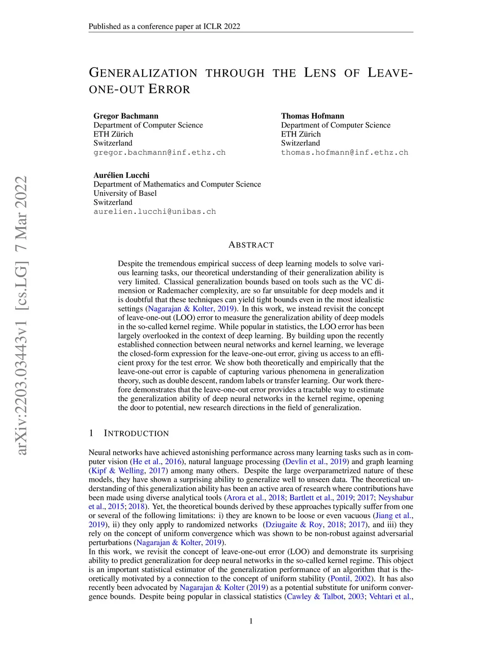 Despite the tremendous empirical success of deep learning models to solve various learning tasks, our theoretical understanding of their generalization ability is very limited. Classical generalization bounds based on tools such as the VC dimension or Rademacher complexity, are so far unsuitable for deep models and it is doubtful that these techniques can yield tight bounds even in the most idealistic settings (Nagarajan & Kolter, 2019). In this work, we instead revisit the concept of leave-one-out (LOO) error to measure the generalization ability of deep models in the so-called kernel regime. While popular in statistics, the LOO error has been largely overlooked in the context of deep learning. By building upon the recently established connection between neural networks and kernel learning, we leverage the closed-form expression for the leave-one-out error, giving us access to an efficient proxy for the test error. We show both theoretically and empirically that the leave-one-out error is capable of capturing various phenomena in generalization theory, such as double descent, random labels or transfer learning. Our work therefore demonstrates that the leave-one-out error provides a tractable way to estimate the generalization ability of deep neural networks in the kernel regime, opening the door to potential, new research directions in the field of generalization.