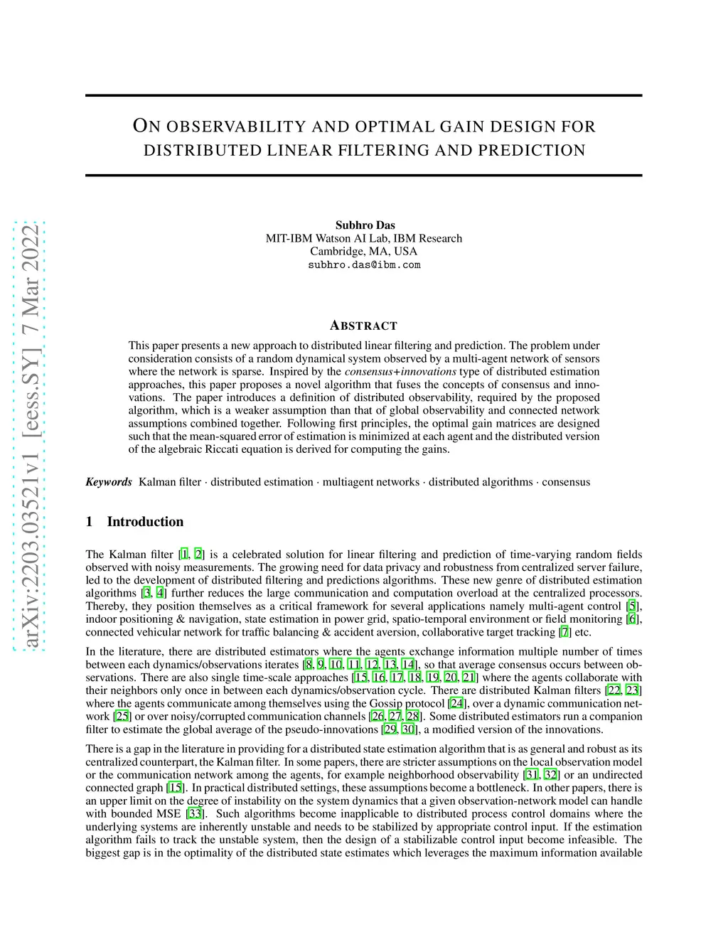 This paper presents a new approach to distributed linear filtering and prediction. The problem under consideration consists of a random dynamical system observed by a multi-agent network of sensors where the network is sparse. Inspired by the consensus+innovations type of distributed estimation approaches, this paper proposes a novel algorithm that fuses the concepts of consensus and innovations. The paper introduces a definition of distributed observability, required by the proposed algorithm, which is a weaker assumption than that of global observability and connected network assumptions combined together. Following first principles, the optimal gain matrices are designed such that the mean-squared error of estimation is minimized at each agent and the distributed version of the algebraic Riccati equation is derived for computing the gains.