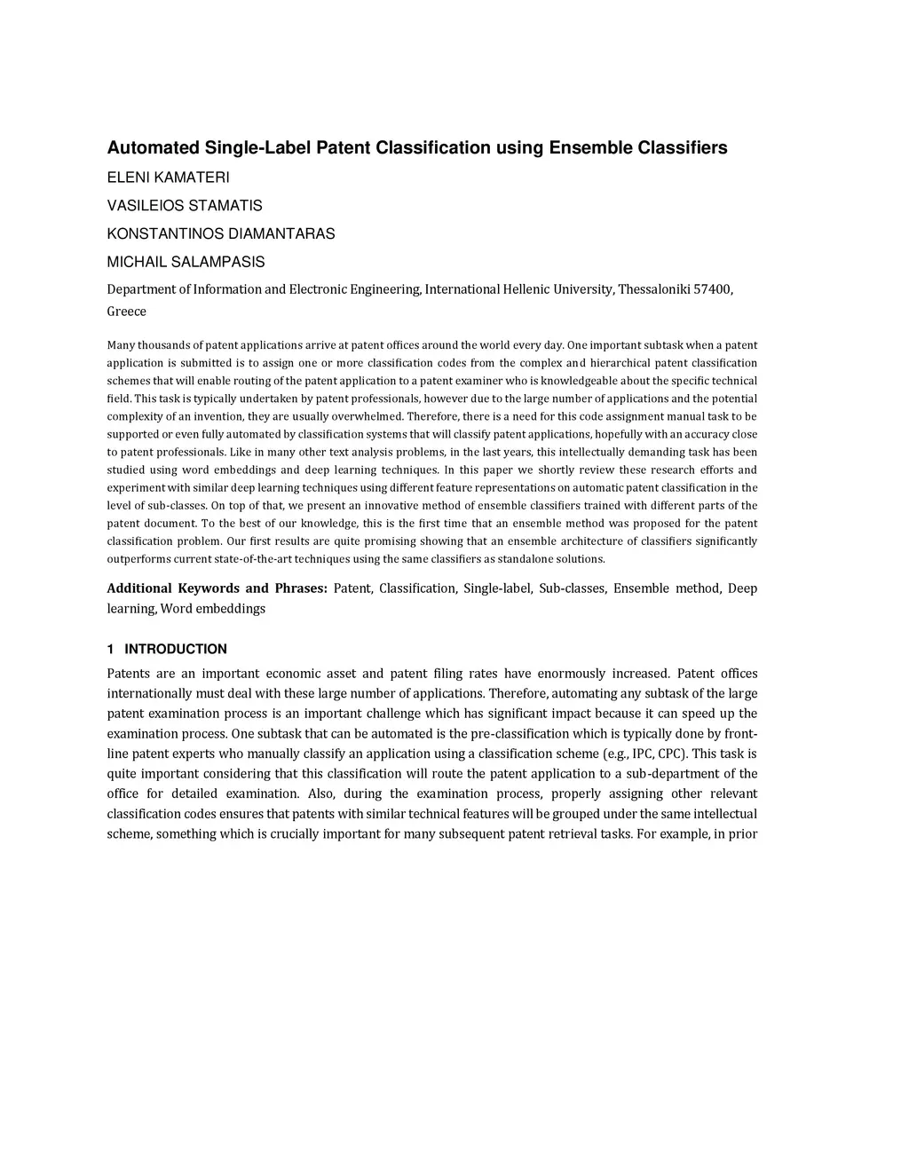 Many thousands of patent applications arrive at patent offices around the world every day. One important subtask when a patent application is submitted is to assign one or more classification codes from the complex and hierarchical patent classification schemes that will enable routing of the patent application to a patent examiner who is knowledgeable about the specific technical field. This task is typically undertaken by patent professionals, however due to the large number of applications and the potential complexity of an invention, they are usually overwhelmed. Therefore, there is a need for this code assignment manual task to be supported or even fully automated by classification systems that will classify patent applications, hopefully with an accuracy close to patent professionals. Like in many other text analysis problems, in the last years, this intellectually demanding task has been studied using word embeddings and deep learning techniques. In this paper we shortly review these research efforts and experiment with similar deep learning techniques using different feature representations on automatic patent classification in the level of sub-classes. On top of that, we present an innovative method of ensemble classifiers trained with different parts of the patent document. To the best of our knowledge, this is the first time that an ensemble method was proposed for the patent classification problem. Our first results are quite promising showing that an ensemble architecture of classifiers significantly outperforms current state-of-the-art techniques using the same classifiers as standalone solutions.