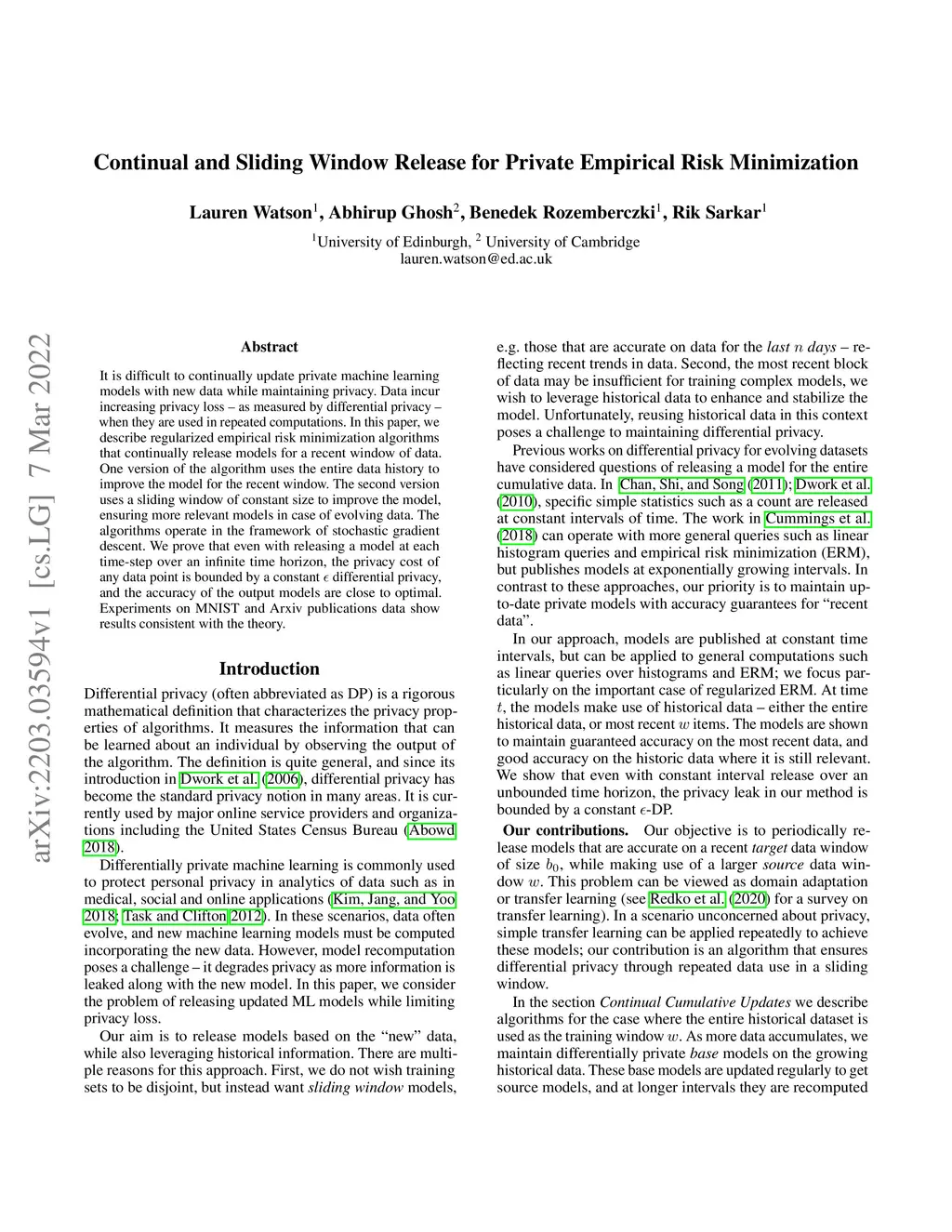 It is difficult to continually update private machine learning models with new data while maintaining privacy. Data incur increasing privacy loss -- as measured by differential privacy -- when they are used in repeated computations. In this paper, we describe regularized empirical risk minimization algorithms that continually release models for a recent window of data. One version of the algorithm uses the entire data history to improve the model for the recent window. The second version uses a sliding window of constant size to improve the model, ensuring more relevant models in case of evolving data. The algorithms operate in the framework of stochastic gradient descent. We prove that even with releasing a model at each time-step over an infinite time horizon, the privacy cost of any data point is bounded by a constant differential privacy, and the accuracy of the output models are close to optimal. Experiments on MNIST and Arxiv publications data show results consistent with the theory.