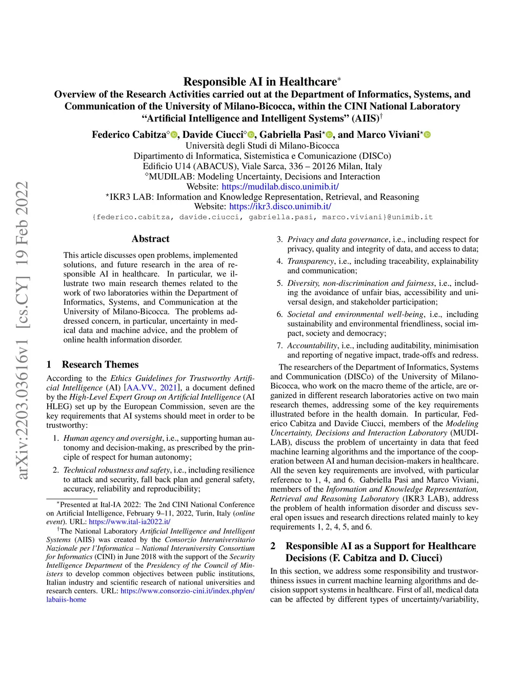 This article discusses open problems, implemented solutions, and future research in the area of responsible AI in healthcare. In particular, we illustrate two main research themes related to the work of two laboratories within the Department of Informatics, Systems, and Communication at the University of Milano-Bicocca. The problems addressed concern, in particular, {uncertainty in medical data and machine advice}, and the problem of online health information disorder.
