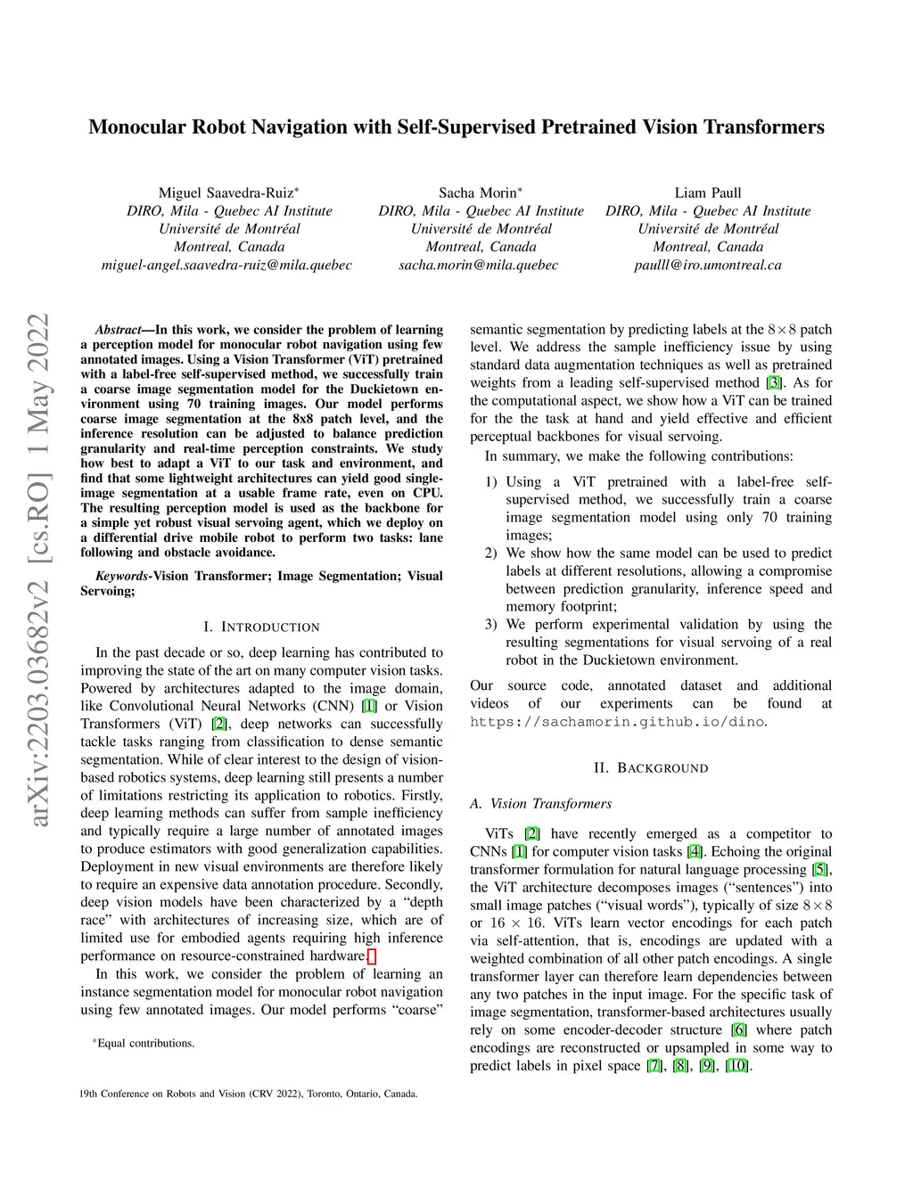 In this work, we consider the problem of learning a perception model for monocular robot navigation using few annotated images. Using a Vision Transformer (ViT) pretrained with a label-free self-supervised method, we successfully train a coarse image segmentation model for the Duckietown environment using 70 training images. Our model performs coarse image segmentation at the 8x8 patch level, and the inference resolution can be adjusted to balance prediction granularity and real-time perception constraints. We study how best to adapt a ViT to our task and environment, and find that some lightweight architectures can yield good single-image segmentation at a usable frame rate, even on CPU. The resulting perception model is used as the backbone for a simple yet robust visual servoing agent, which we deploy on a differential drive mobile robot to perform two tasks: lane following and obstacle avoidance.