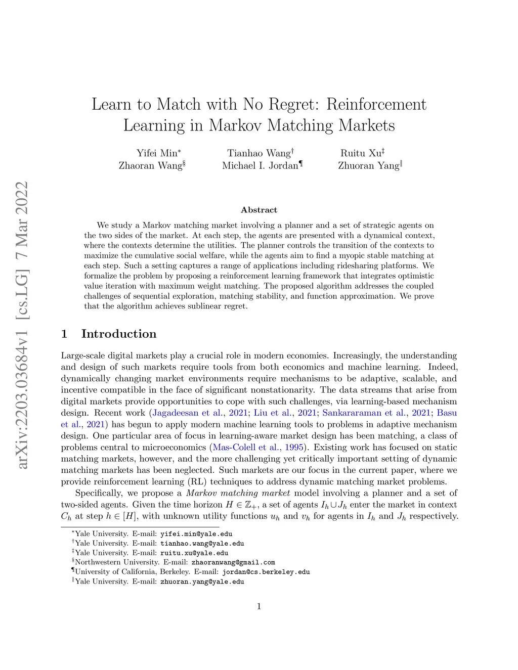 Learn to Match with No Regret: Reinforcement Learning in Markov Matching