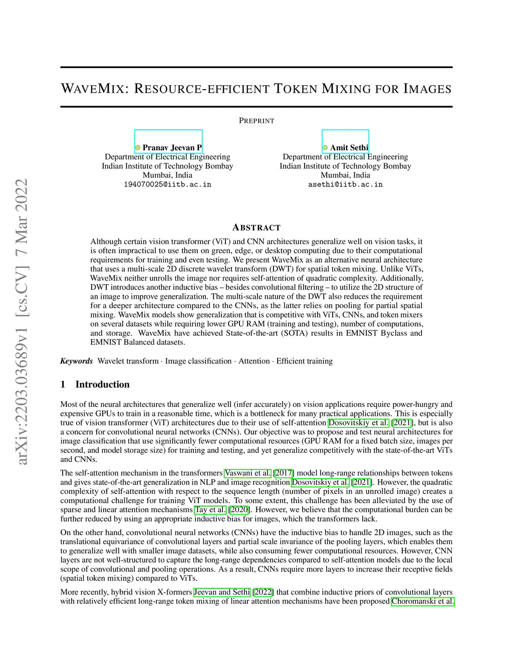 Although certain vision transformer (ViT) and CNN architectures generalize well on vision tasks, it is often impractical to use them on green, edge, or desktop computing due to their computational requirements for training and even testing. We present WaveMix as an alternative neural architecture that uses a multi-scale 2D discrete wavelet transform (DWT) for spatial token mixing. Unlike ViTs, WaveMix neither unrolls the image nor requires self-attention of quadratic complexity. Additionally, DWT introduces another inductive bias -- besides convolutional filtering -- to utilize the 2D structure of an image to improve generalization. The multi-scale nature of the DWT also reduces the requirement for a deeper architecture compared to the CNNs, as the latter relies on pooling for partial spatial mixing. WaveMix models show generalization that is competitive with ViTs, CNNs, and token mixers on several datasets while requiring lower GPU RAM (training and testing), number of computations, and storage. WaveMix have achieved State-of-the-art (SOTA) results in EMNIST Byclass and EMNIST Balanced datasets.