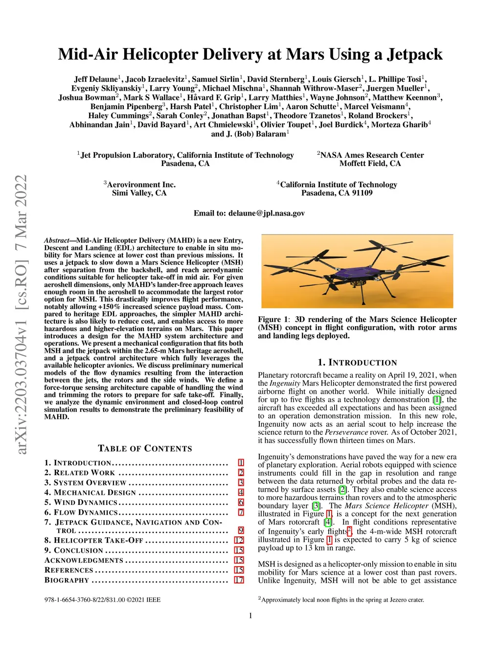 Mid-Air Helicopter Delivery at Mars Using a Jetpack