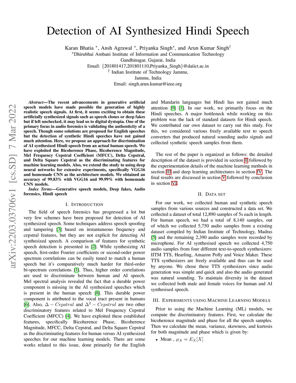 The recent advancements in generative artificial speech models have made possible the generation of highly realistic speech signals. At first, it seems exciting to obtain these artificially synthesized signals such as speech clones or deep fakes but if left unchecked, it may lead us to digital dystopia. One of the primary focus in audio forensics is validating the authenticity of a speech. Though some solutions are proposed for English speeches but the detection of synthetic Hindi speeches have not gained much attention. Here, we propose an approach for discrimination of AI synthesized Hindi speech from an actual human speech. We have exploited the Bicoherence Phase, Bicoherence Magnitude, Mel Frequency Cepstral Coefficient (MFCC), Delta Cepstral, and Delta Square Cepstral as the discriminating features for machine learning models. Also, we extend the study to using deep neural networks for extensive experiments, specifically VGG16 and homemade CNN as the architecture models. We obtained an accuracy of 99.83% with VGG16 and 99.99% with homemade CNN models.