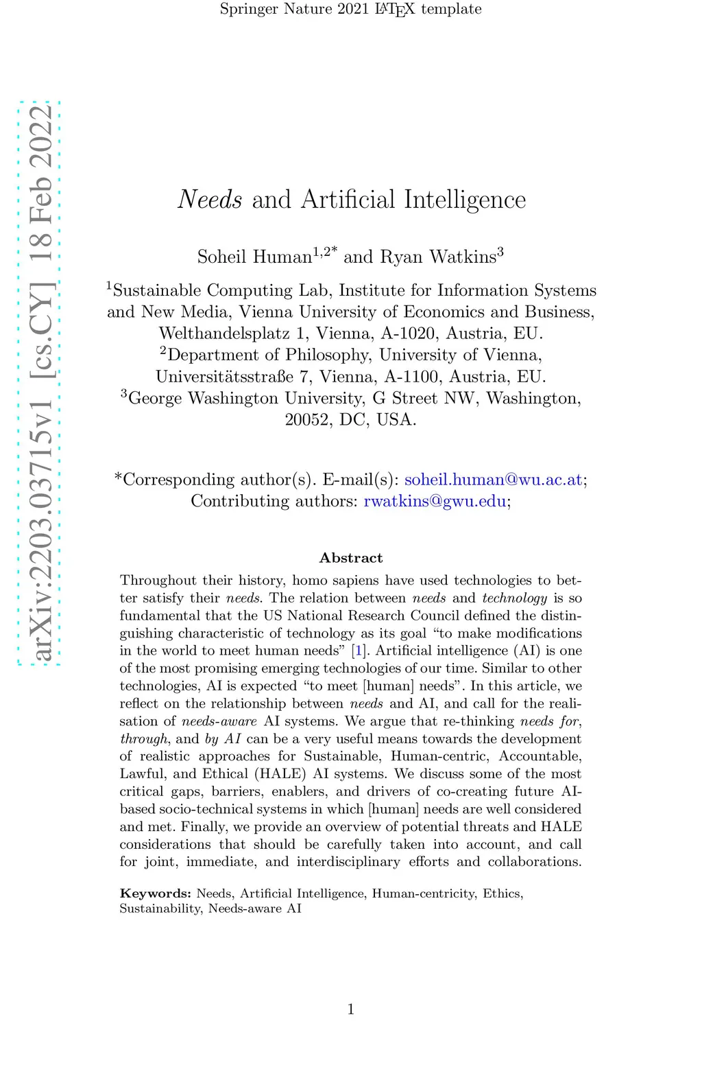 Throughout their history, homo sapiens have used technologies to better satisfy their needs. The relation between needs and technology is so fundamental that the US National Research Council defined the distinguishing characteristic of technology as its goal "to make modifications in the world to meet human needs". Artificial intelligence (AI) is one of the most promising emerging technologies of our time. Similar to other technologies, AI is expected "to meet [human] needs". In this article, we reflect on the relationship between needs and AI, and call for the realisation of needs-aware AI systems. We argue that re-thinking needs for, through, and by AI can be a very useful means towards the development of realistic approaches for Sustainable, Human-centric, Accountable, Lawful, and Ethical (HALE) AI systems. We discuss some of the most critical gaps, barriers, enablers, and drivers of co-creating future AI-based socio-technical systems in which [human] needs are well considered and met. Finally, we provide an overview of potential threats and HALE considerations that should be carefully taken into account, and call for joint, immediate, and interdisciplinary efforts and collaborations.