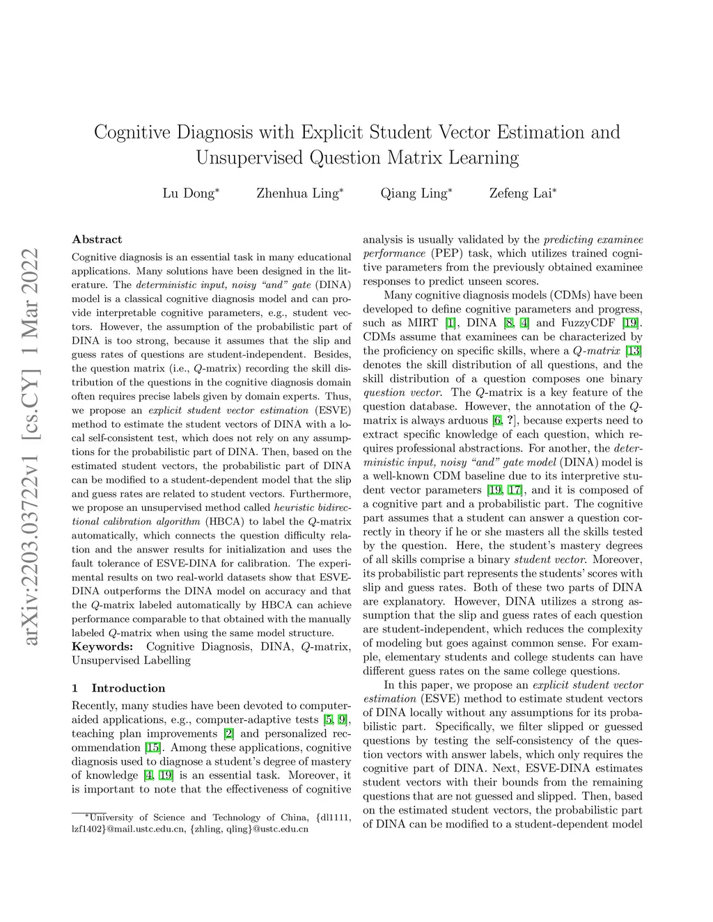 Cognitive diagnosis is an essential task in many educational applications. Many solutions have been designed in the literature. The deterministic input, noisy "and" gate (DINA) model is a classical cognitive diagnosis model and can provide interpretable cognitive parameters, e.g., student vectors. However, the assumption of the probabilistic part of DINA is too strong, because it assumes that the slip and guess rates of questions are student-independent. Besides, the question matrix (i.e., Q-matrix) recording the skill distribution of the questions in the cognitive diagnosis domain often requires precise labels given by domain experts. Thus, we propose an explicit student vector estimation (ESVE) method to estimate the student vectors of DINA with a local self-consistent test, which does not rely on any assumptions for the probabilistic part of DINA. Then, based on the estimated student vectors, the probabilistic part of DINA can be modified to a student dependent model that the slip and guess rates are related to student vectors. Furthermore, we propose an unsupervised method called heuristic bidirectional calibration algorithm (HBCA) to label the Q-matrix automatically, which connects the question difficulty relation and the answer results for initialization and uses the fault tolerance of ESVE-DINA for calibration. The experimental results on two real-world datasets show that ESVE-DINA outperforms the DINA model on accuracy and that the Q-matrix labeled automatically by HBCA can achieve performance comparable to that obtained with the manually labeled Q-matrix when using the same model structure.