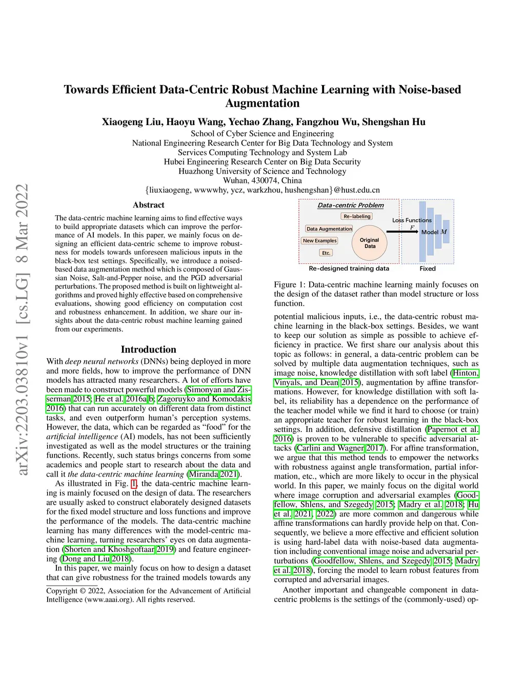 The data-centric machine learning aims to find effective ways to build appropriate datasets which can improve the performance of AI models. In this paper, we mainly focus on designing an efficient data-centric scheme to improve robustness for models towards unforeseen malicious inputs in the black-box test settings. Specifically, we introduce a noised-based data augmentation method which is composed of Gaussian Noise, Salt-and-Pepper noise, and the PGD adversarial perturbations. The proposed method is built on lightweight algorithms and proved highly effective based on comprehensive evaluations, showing good efficiency on computation cost and robustness enhancement. In addition, we share our insights about the data-centric robust machine learning gained from our experiments.