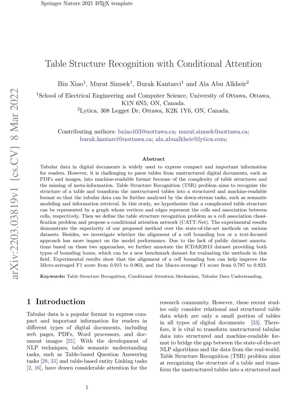 Tabular data in digital documents is widely used to express compact and important information for readers. However, it is challenging to parse tables from unstructured digital documents, such as PDFs and images, into machine-readable format because of the complexity of table structures and the missing of meta-information. Table Structure Recognition (TSR) problem aims to recognize the structure of a table and transform the unstructured tables into a structured and machine-readable format so that the tabular data can be further analysed by the down-stream tasks, such as semantic modeling and information retrieval. In this study, we hypothesize that a complicated table structure can be represented by a graph whose vertices and edges represent the cells and association between cells, respectively. Then we define the table structure recognition problem as a cell association classification problem and propose a conditional attention network (CATT-Net). The experimental results demonstrate the superiority of our proposed method over the state-of-the-art methods on various datasets. Besides, we investigate whether the alignment of a cell bounding box or a text-focused approach has more impact on the model performance. Due to the lack of public dataset annotations based on these two approaches, we further annotate the ICDAR2013 dataset providing both types of bounding boxes, which can be a new benchmark dataset for evaluating the methods in this field. Experimental results show that the alignment of a cell bounding box can help improve the Micro-averaged F1 score from 0.915 to 0.963, and the Macro-average F1 score from 0.787 to 0.923.