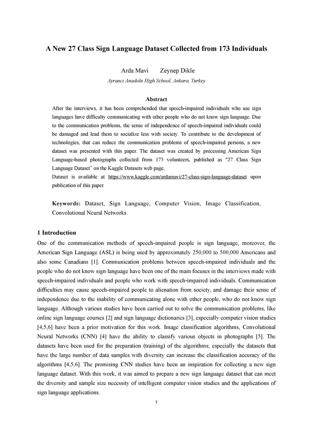 After the interviews, it has been comprehended that speech-impaired individuals who use sign languages have difficulty communicating with other people who do not know sign language. Due to the communication problems, the sense of independence of speech-impaired individuals could be damaged and lead them to socialize less with society. To contribute to the development of technologies, that can reduce the communication problems of speech-impaired persons, a new dataset was presented with this paper. The dataset was created by processing American Sign Language-based photographs collected from 173 volunteers, published as 27 Class Sign Language Dataset on the Kaggle Datasets web page.