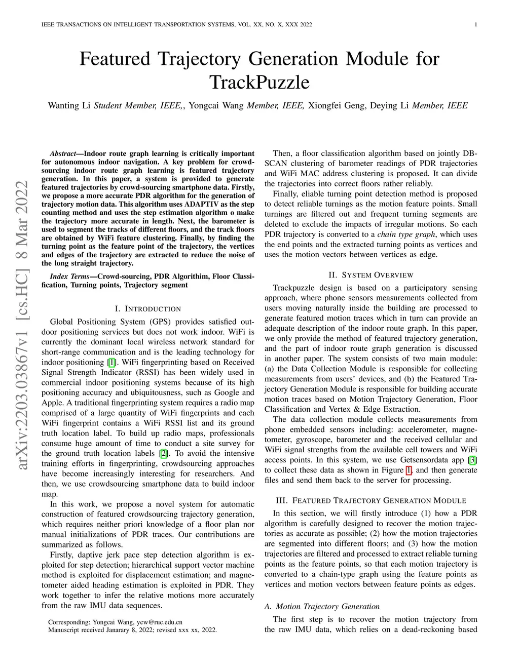 Indoor route graph learning is critically important for autonomous indoor navigation. A key problem for crowd-sourcing indoor route graph learning is featured trajectory generation. In this paper, a system is provided to generate featured trajectories by crowd-sourcing smartphone data. Firstly, we propose a more accurate PDR algorithm for the generation of trajectory motion data. This algorithm uses ADAPTIV as the step counting method and uses the step estimation algorithm o make the trajectory more accurate in length. Next, the barometer is used to segment the tracks of different floors, and the track floors are obtained by WiFi feature clustering. Finally, by finding the turning point as the feature point of the trajectory, the vertices and edges of the trajectory are extracted to reduce the noise of the long straight trajectory.