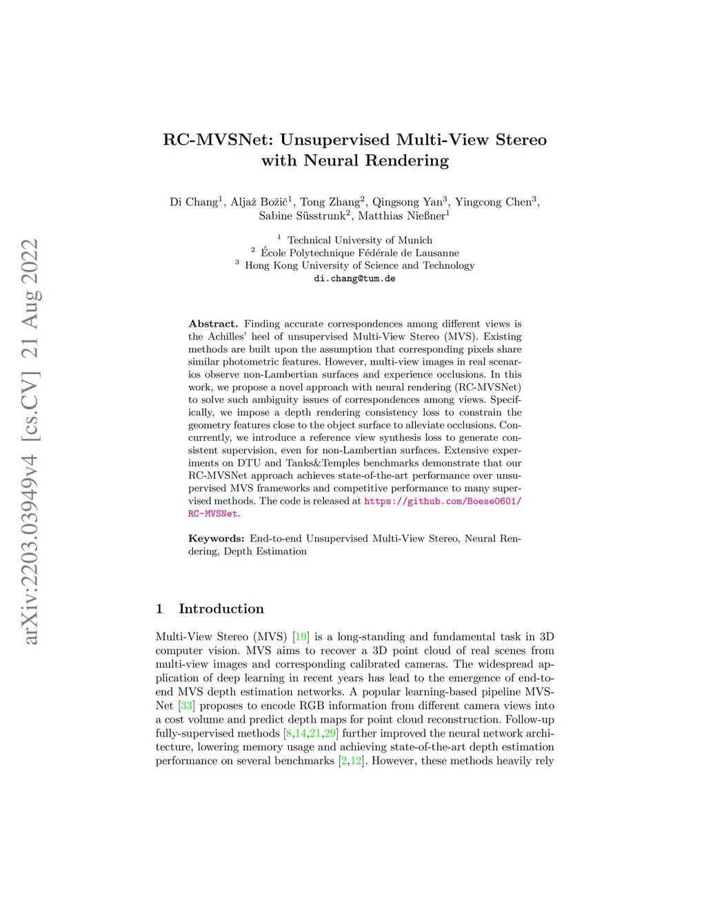 RC-MVSNet: Unsupervised Multi-View Stereo with Neural Rendering