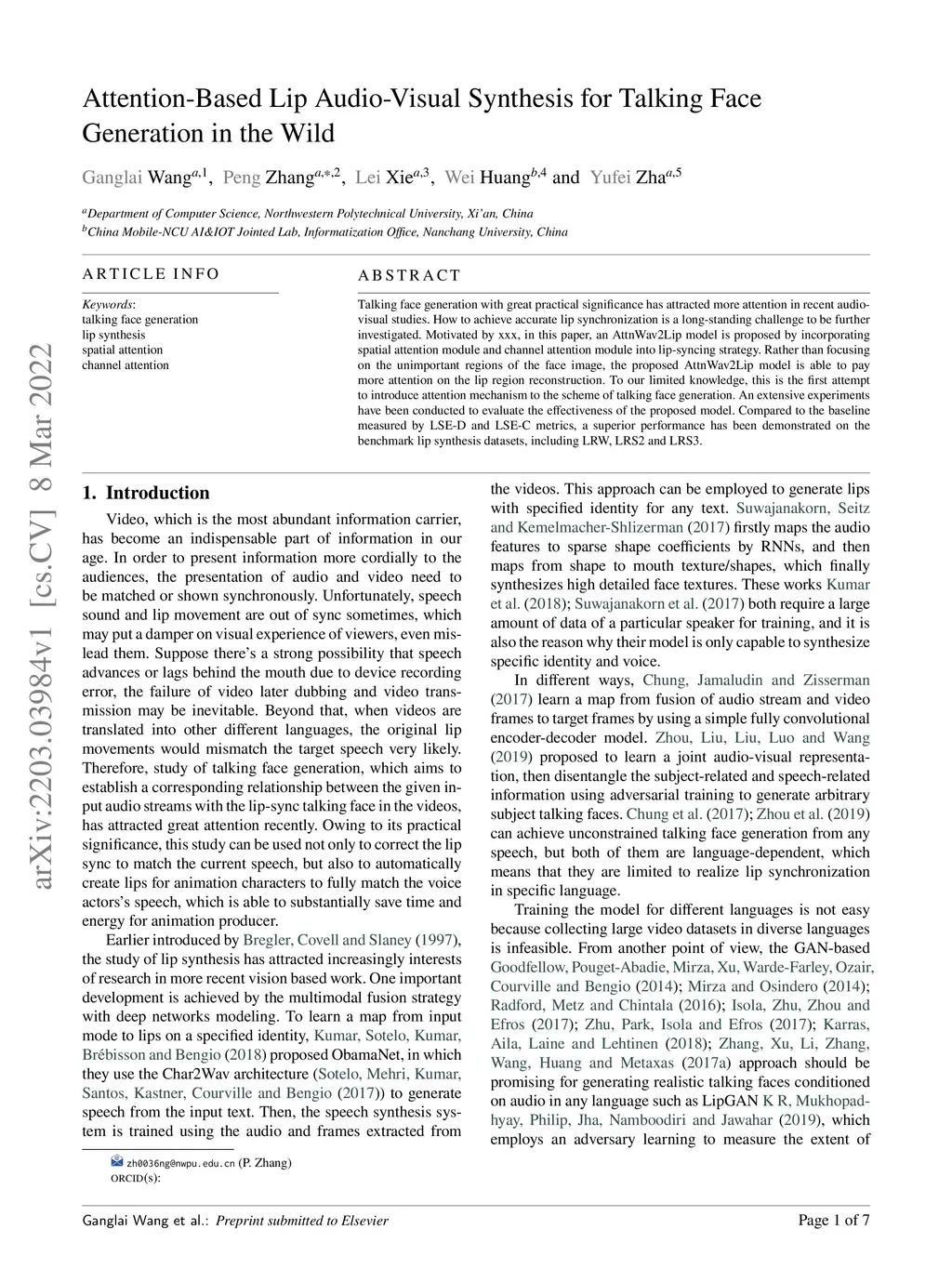 Attention-Based Lip Audio-Visual Synthesis for Talking Face Generation