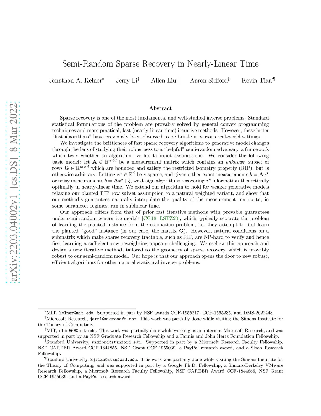 Sparse recovery is one of the most fundamental and well-studied inverse problems. Standard statistical formulations of the problem are provably solved by general convex programming techniques and more practical, fast (nearly-linear time) iterative methods. However, these latter "fast algorithms" have previously been observed to be brittle in various real-world settings. We investigate the brittleness of fast sparse recovery algorithms to generative model changes through the lens of studying their robustness to a "helpful" semi-random adversary, a framework which tests whether an algorithm overfits to input assumptions. We consider the following basic model: let be a measurement matrix which contains an unknown subset of rows which are bounded and satisfy the restricted isometry property (RIP), but is otherwise arbitrary. Letting be -sparse, and given either exact measurements or noisy measurements , we design algorithms recovering information-theoretically optimally in nearly-linear time. We extend our algorithm to hold for weaker generative models relaxing our planted RIP assumption to a natural weighted variant, and show that our method's guarantees naturally interpolate the quality of the measurement matrix to, in some parameter regimes, run in sublinear time. Our approach differs from prior fast iterative methods with provable guarantees under semi-random generative models: natural conditions on a submatrix which make sparse recovery tractable are NP-hard to verify. We design a new iterative method tailored to the geometry of sparse recovery which is provably robust to our semi-random model. We hope our approach opens the door to new robust, efficient algorithms for natural statistical inverse problems.