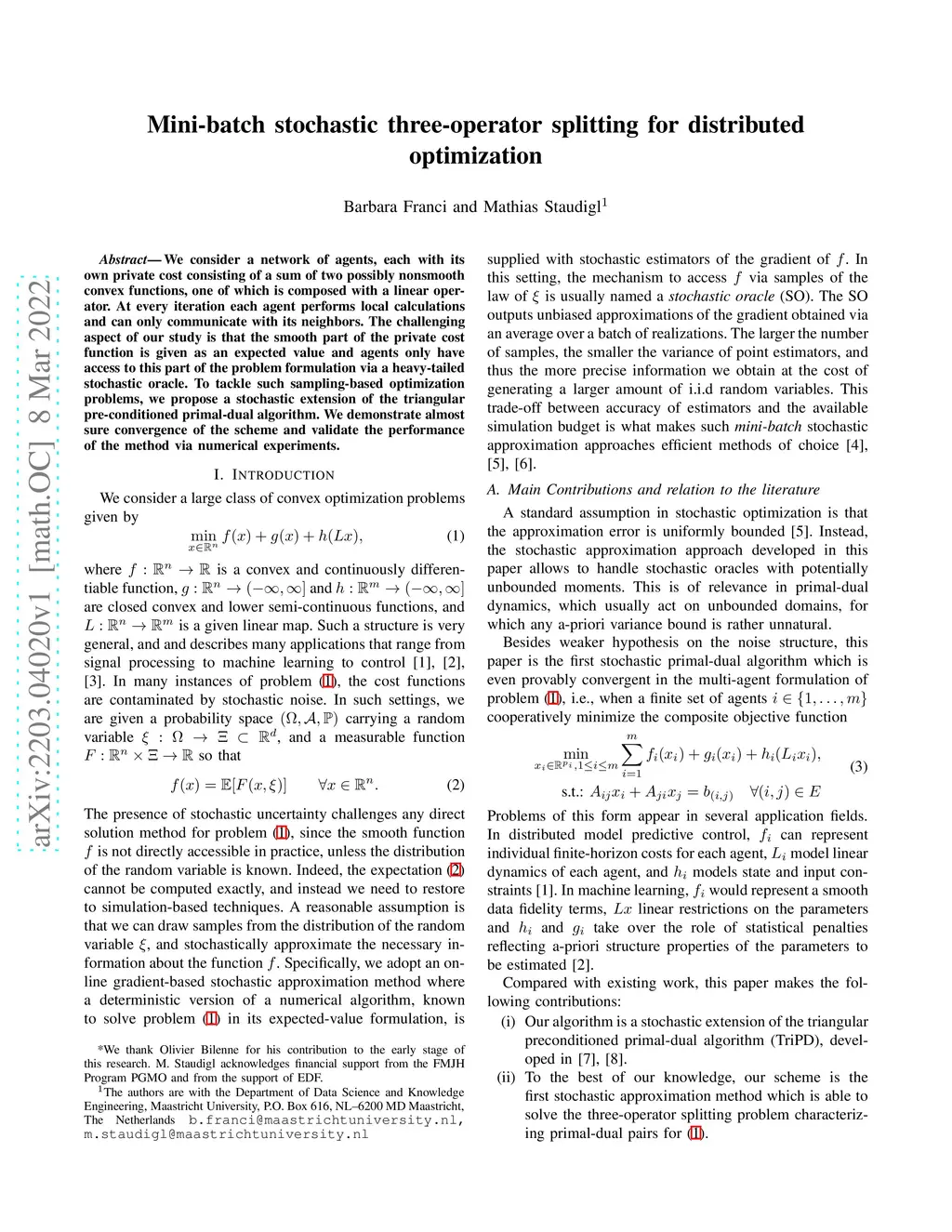 We consider a network of agents, each with its own private cost consisting of a sum of two possibly nonsmooth convex functions, one of which is composed with a linear operator. At every iteration each agent performs local calculations and can only communicate with its neighbors. The challenging aspect of our study is that the smooth part of the private cost function is given as an expected value and agents only have access to this part of the problem formulation via a heavy-tailed stochastic oracle. To tackle such sampling-based optimization problems, we propose a stochastic extension of the triangular pre-conditioned primal-dual algorithm. We demonstrate almost sure convergence of the scheme and validate the performance of the method via numerical experiments.