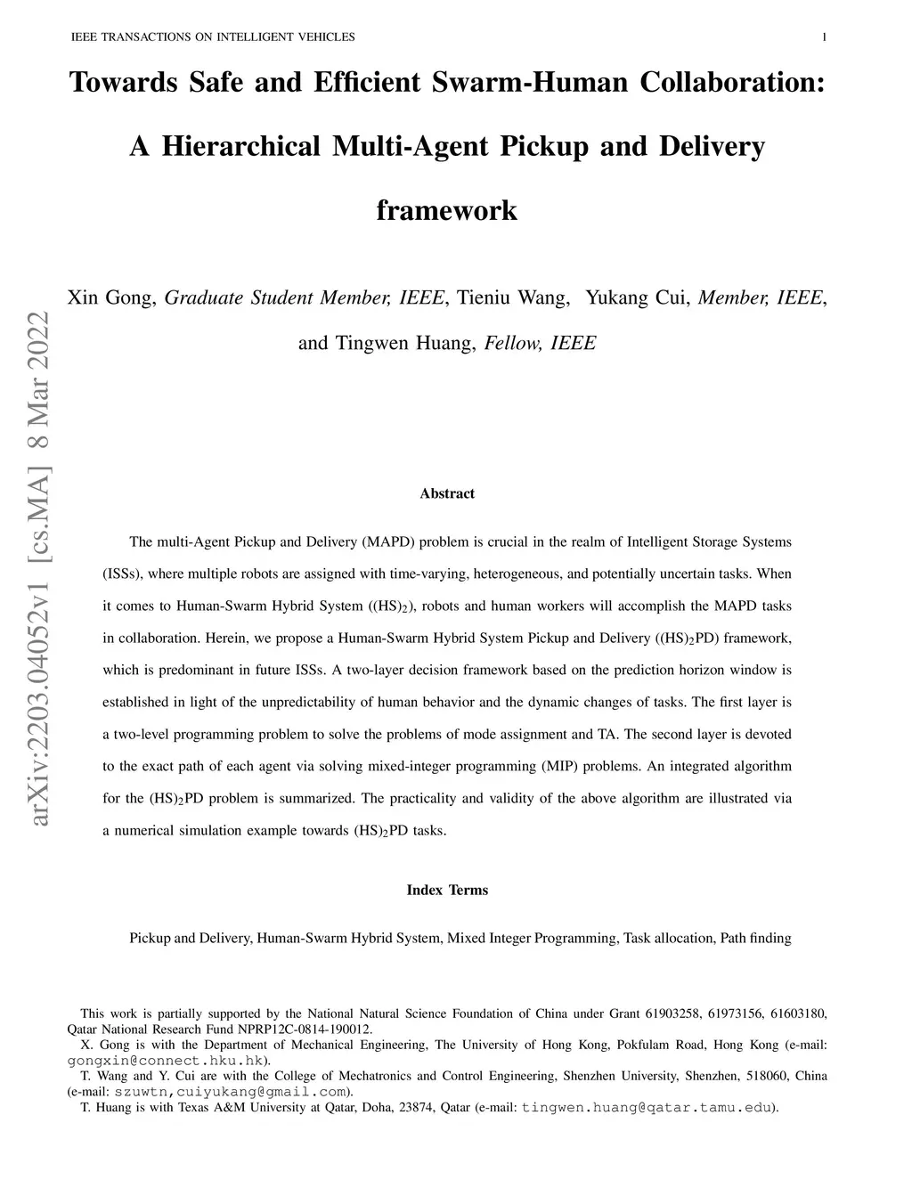 The multi-Agent Pickup and Delivery (MAPD) problem is crucial in the realm of Intelligent Storage Systems (ISSs), where multiple robots are assigned with time-varying, heterogeneous, and potentially uncertain tasks. When it comes to Human-Swarm Hybrid System ((HS)), robots and human workers will accomplish the MAPD tasks in collaboration. Herein, we propose a Human-Swarm Hybrid System Pickup and Delivery ((HS)PD) framework, which is predominant in future ISSs. A two-layer decision framework based on the prediction horizon window is established in light of the unpredictability of human behavior and the dynamic changes of tasks. The first layer is a two-level programming problem to solve the problems of mode assignment and TA. The second layer is devoted to the exact path of each agent via solving mixed-integer programming (MIP) problems. An integrated algorithm for the (HS)PD problem is summarized. The practicality and validity of the above algorithm are illustrated via a numerical simulation example towards (HS)PD tasks.