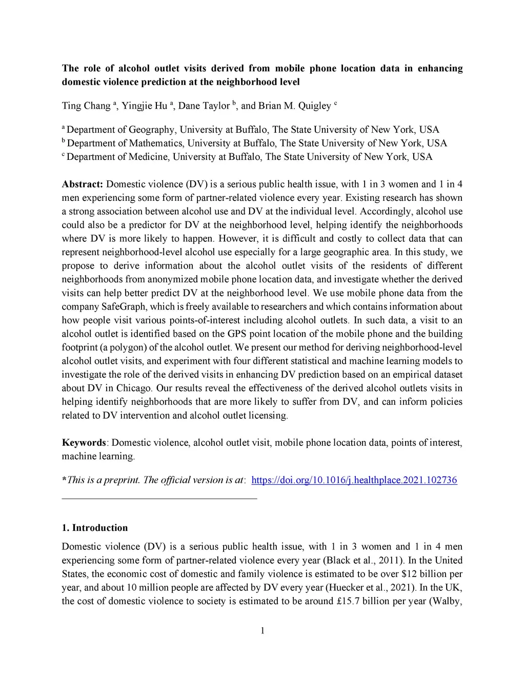 Domestic violence (DV) is a serious public health issue, with 1 in 3 women and 1 in 4 men experiencing some form of partner-related violence every year. Existing research has shown a strong association between alcohol use and DV at the individual level. Accordingly, alcohol use could also be a predictor for DV at the neighborhood level, helping identify the neighborhoods where DV is more likely to happen. However, it is difficult and costly to collect data that can represent neighborhood-level alcohol use especially for a large geographic area. In this study, we propose to derive information about the alcohol outlet visits of the residents of different neighborhoods from anonymized mobile phone location data, and investigate whether the derived visits can help better predict DV at the neighborhood level. We use mobile phone data from the company SafeGraph, which is freely available to researchers and which contains information about how people visit various points-of-interest including alcohol outlets. In such data, a visit to an alcohol outlet is identified based on the GPS point location of the mobile phone and the building footprint (a polygon) of the alcohol outlet. We present our method for deriving neighborhood-level alcohol outlet visits, and experiment with four different statistical and machine learning models to investigate the role of the derived visits in enhancing DV prediction based on an empirical dataset about DV in Chicago. Our results reveal the effectiveness of the derived alcohol outlets visits in helping identify neighborhoods that are more likely to suffer from DV, and can inform policies related to DV intervention and alcohol outlet licensing.
