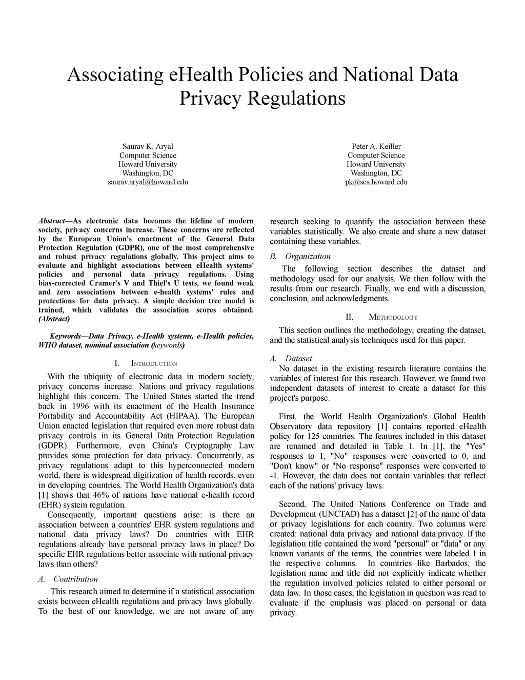 As electronic data becomes the lifeline of modern society, privacy concerns increase. These concerns are reflected by the European Union's enactment of the General Data Protection Regulation (GDPR), one of the most comprehensive and robust privacy regulations globally. This project aims to evaluate and highlight associations between eHealth systems' policies and personal data privacy regulations. Using bias-corrected Cramer's V and Thiel's U tests, we found weak and zero associations between e-health systems' rules and protections for data privacy. A simple decision tree model is trained, which validates the association scores obtained