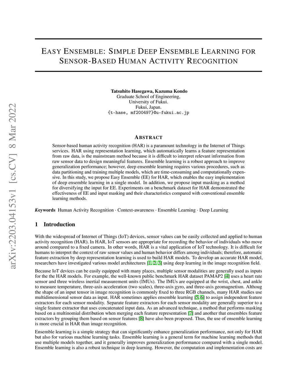 Sensor-based human activity recognition (HAR) is a paramount technology in the Internet of Things services. HAR using representation learning, which automatically learns a feature representation from raw data, is the mainstream method because it is difficult to interpret relevant information from raw sensor data to design meaningful features. Ensemble learning is a robust approach to improve generalization performance; however, deep ensemble learning requires various procedures, such as data partitioning and training multiple models, which are time-consuming and computationally expensive. In this study, we propose Easy Ensemble (EE) for HAR, which enables the easy implementation of deep ensemble learning in a single model. In addition, we propose input masking as a method for diversifying the input for EE. Experiments on a benchmark dataset for HAR demonstrated the effectiveness of EE and input masking and their characteristics compared with conventional ensemble learning methods.