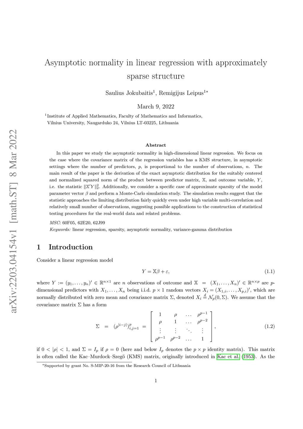 In this paper we study the asymptotic normality in high-dimensional linear regression. We focus on the case where the covariance matrix of the regression variables has a KMS structure, in asymptotic settings where the number of predictors, , is proportional to the number of observations, . The main result of the paper is the derivation of the exact asymptotic distribution for the suitably centered and normalized squared norm of the product between predictor matrix, , and outcome variable, , i.e. the statistic . Additionally, we consider a specific case of approximate sparsity of the model parameter vector and perform a Monte-Carlo simulation study. The simulation results suggest that the statistic approaches the limiting distribution fairly quickly even under high variable multi-correlation and relatively small number of observations, suggesting possible applications to the construction of statistical testing procedures for the real-world data and related problems.