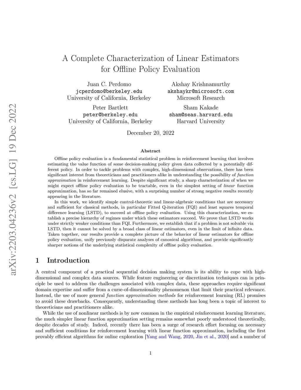 Offline policy evaluation is a fundamental statistical problem in reinforcement learning that involves estimating the value function of some decision-making policy given data collected by a potentially different policy. In order to tackle problems with complex, high-dimensional observations, there has been significant interest from theoreticians and practitioners alike in understanding the possibility of function approximation in reinforcement learning. Despite significant study, a sharp characterization of when we might expect offline policy evaluation to be tractable, even in the simplest setting of linear function approximation, has so far remained elusive, with a surprising number of strong negative results recently appearing in the literature. In this work, we identify simple control-theoretic and linear-algebraic conditions that are necessary and sufficient for classical methods, in particular Fitted Q-iteration (FQI) and least squares temporal difference learning (LSTD), to succeed at offline policy evaluation. Using this characterization, we establish a precise hierarchy of regimes under which these estimators succeed. We prove that LSTD works under strictly weaker conditions than FQI. Furthermore, we establish that if a problem is not solvable via LSTD, then it cannot be solved by a broad class of linear estimators, even in the limit of infinite data. Taken together, our results provide a complete picture of the behavior of linear estimators for offline policy evaluation, unify previously disparate analyses of canonical algorithms, and provide significantly sharper notions of the underlying statistical complexity of offline policy evaluation.