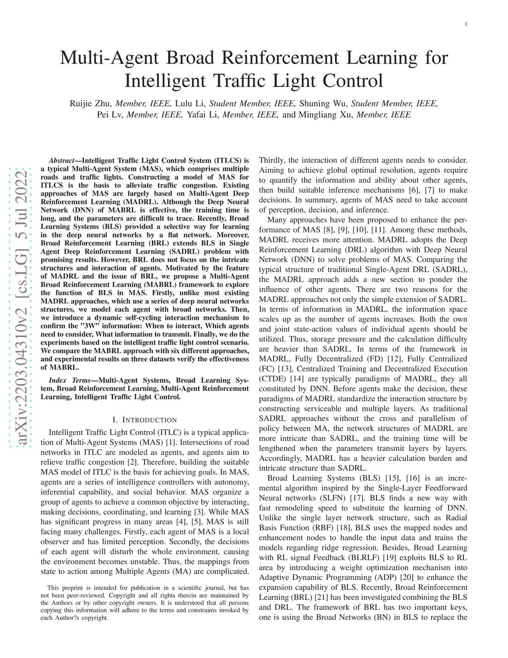 Multi-Agent Broad Reinforcement Learning for Intelligent Traffic Light