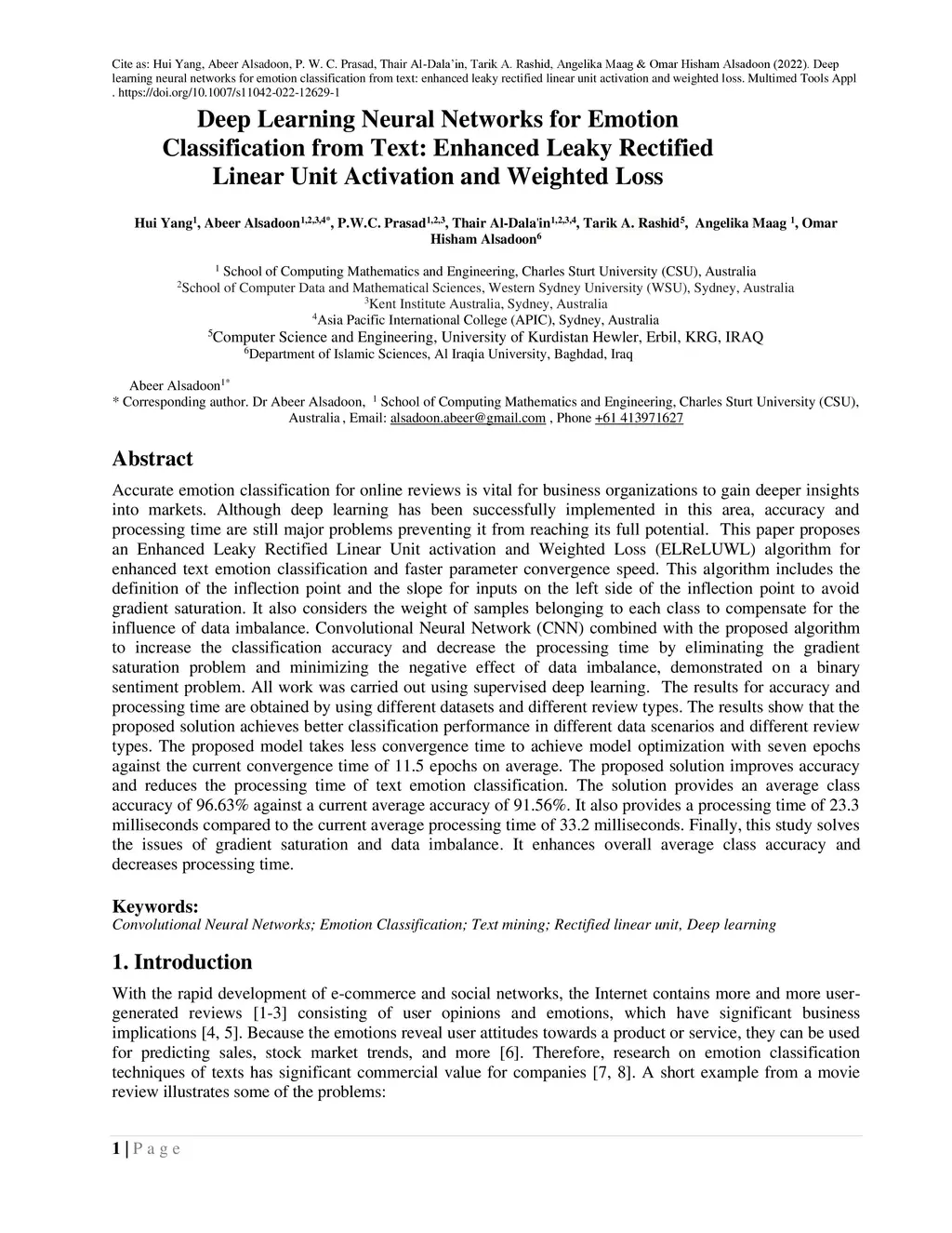 Accurate emotion classification for online reviews is vital for business organizations to gain deeper insights into markets. Although deep learning has been successfully implemented in this area, accuracy and processing time are still major problems preventing it from reaching its full potential. This paper proposes an Enhanced Leaky Rectified Linear Unit activation and Weighted Loss (ELReLUWL) algorithm for enhanced text emotion classification and faster parameter convergence speed. This algorithm includes the definition of the inflection point and the slope for inputs on the left side of the inflection point to avoid gradient saturation. It also considers the weight of samples belonging to each class to compensate for the influence of data imbalance. Convolutional Neural Network (CNN) combined with the proposed algorithm to increase the classification accuracy and decrease the processing time by eliminating the gradient saturation problem and minimizing the negative effect of data imbalance, demonstrated on a binary sentiment problem. The results show that the proposed solution achieves better classification performance in different data scenarios and different review types. The proposed model takes less convergence time to achieve model optimization with seven epochs against the current convergence time of 11.5 epochs on average. The proposed solution improves accuracy and reduces the processing time of text emotion classification. The solution provides an average class accuracy of 96.63% against a current average accuracy of 91.56%. It also provides a processing time of 23.3 milliseconds compared to the current average processing time of 33.2 milliseconds. Finally, this study solves the issues of gradient saturation and data imbalance. It enhances overall average class accuracy and decreases processing time.