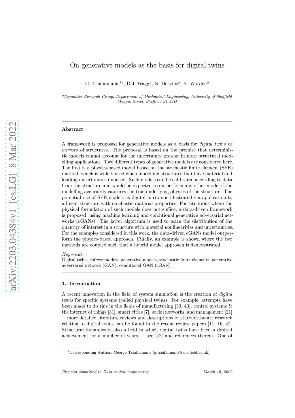 A framework is proposed for generative models as a basis for digital twins or mirrors of structures. The proposal is based on the premise that deterministic models cannot account for the uncertainty present in most structural modelling applications. Two different types of generative models are considered here. The first is a physics-based model based on the stochastic finite element (SFE) method, which is widely used when modelling structures that have material and loading uncertainties imposed. Such models can be calibrated according to data from the structure and would be expected to outperform any other model if the modelling accurately captures the true underlying physics of the structure. The potential use of SFE models as digital mirrors is illustrated via application to a linear structure with stochastic material properties. For situations where the physical formulation of such models does not suffice, a data-driven framework is proposed, using machine learning and conditional generative adversarial networks (cGANs). The latter algorithm is used to learn the distribution of the quantity of interest in a structure with material nonlinearities and uncertainties. For the examples considered in this work, the data-driven cGANs model outperform the physics-based approach. Finally, an example is shown where the two methods are coupled such that a hybrid model approach is demonstrated.