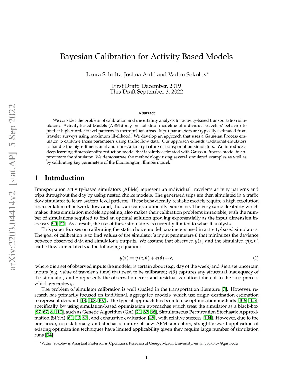 We consider the problem of calibration and uncertainty analysis for activity-based transportation simulators. Activity-Based Models (ABMs) rely on statistical modeling of individual travelers' behavior to predict higher-order travel patterns in metropolitan areas. Input parameters are typically estimated from traveler surveys using maximum likelihood. We develop an approach that uses a Gaussian Process emulator to calibrate those parameters using traffic flow data. Our approach extends traditional emulators to handle the high-dimensional and non-stationary nature of transportation simulators. We introduce a deep learning dimensionality reduction model that is jointly estimated with Gaussin Process model to approximate the simulator. We demonstrate the methodology using several simulated examples as well as by calibrating key parameters of the Bloomington, Illinois model.