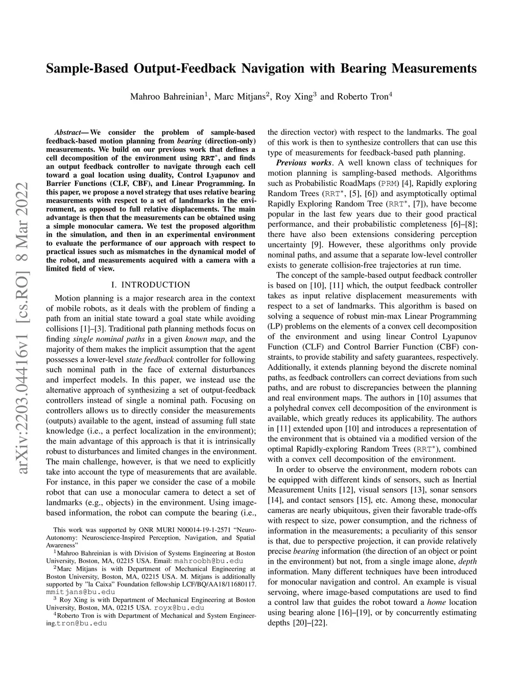 We consider the problem of sample-based feedback-based motion planning from bearing (direction-only) measurements. We build on our previous work that defines a cell decomposition of the environment using RRT*, and finds an output feedback controller to navigate through each cell toward a goal location using duality, Control Lyapunov and Barrier Functions (CLF, CBF), and Linear Programming. In this paper, we propose a novel strategy that uses relative bearing measurements with respect to a set of landmarks in the environment, as opposed to full relative displacements. The main advantage is then that the measurements can be obtained using a simple monocular camera. We test the proposed algorithm in the simulation, and then in an experimental environment to evaluate the performance of our approach with respect to practical issues such as mismatches in the dynamical model of the robot, and measurements acquired with a camera with a limited field of view.