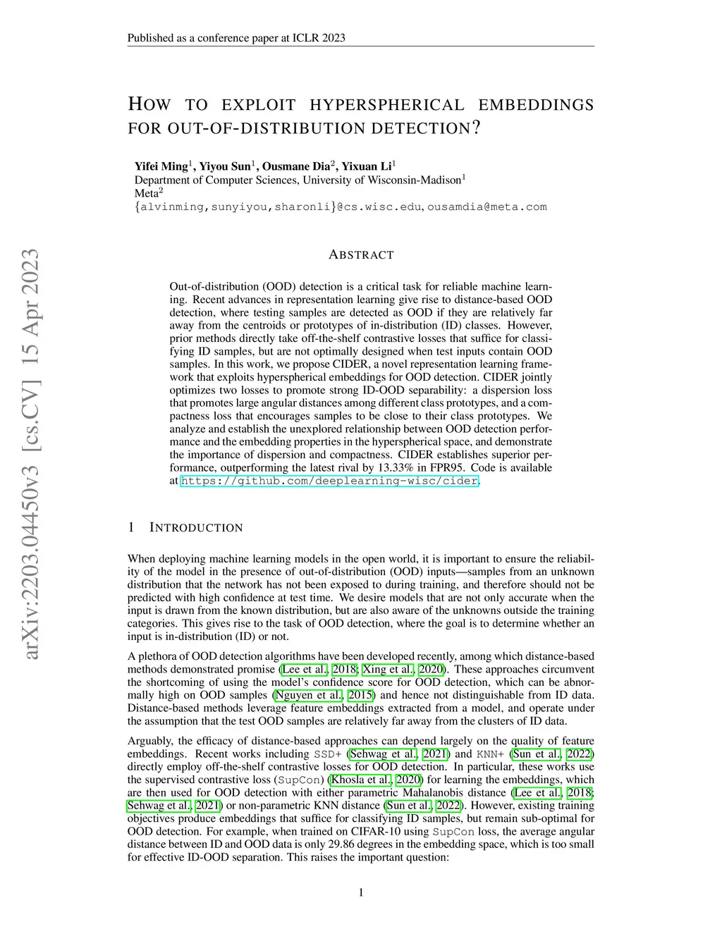 Out-of-distribution (OOD) detection is a critical task for reliable machine learning. Recent advances in representation learning give rise to distance-based OOD detection, where testing samples are detected as OOD if they are relatively far away from the centroids or prototypes of in-distribution (ID) classes. However, prior methods directly take off-the-shelf contrastive losses that suffice for classifying ID samples, but are not optimally designed when test inputs contain OOD samples. In this work, we propose CIDER, a novel representation learning framework that exploits hyperspherical embeddings for OOD detection. CIDER jointly optimizes two losses to promote strong ID-OOD separability: a dispersion loss that promotes large angular distances among different class prototypes, and a compactness loss that encourages samples to be close to their class prototypes. We analyze and establish the unexplored relationship between OOD detection performance and the embedding properties in the hyperspherical space, and demonstrate the importance of dispersion and compactness. CIDER establishes superior performance, outperforming the latest rival by 19.36% in FPR95. Code is available at https://github.com/deeplearning-wisc/cider.