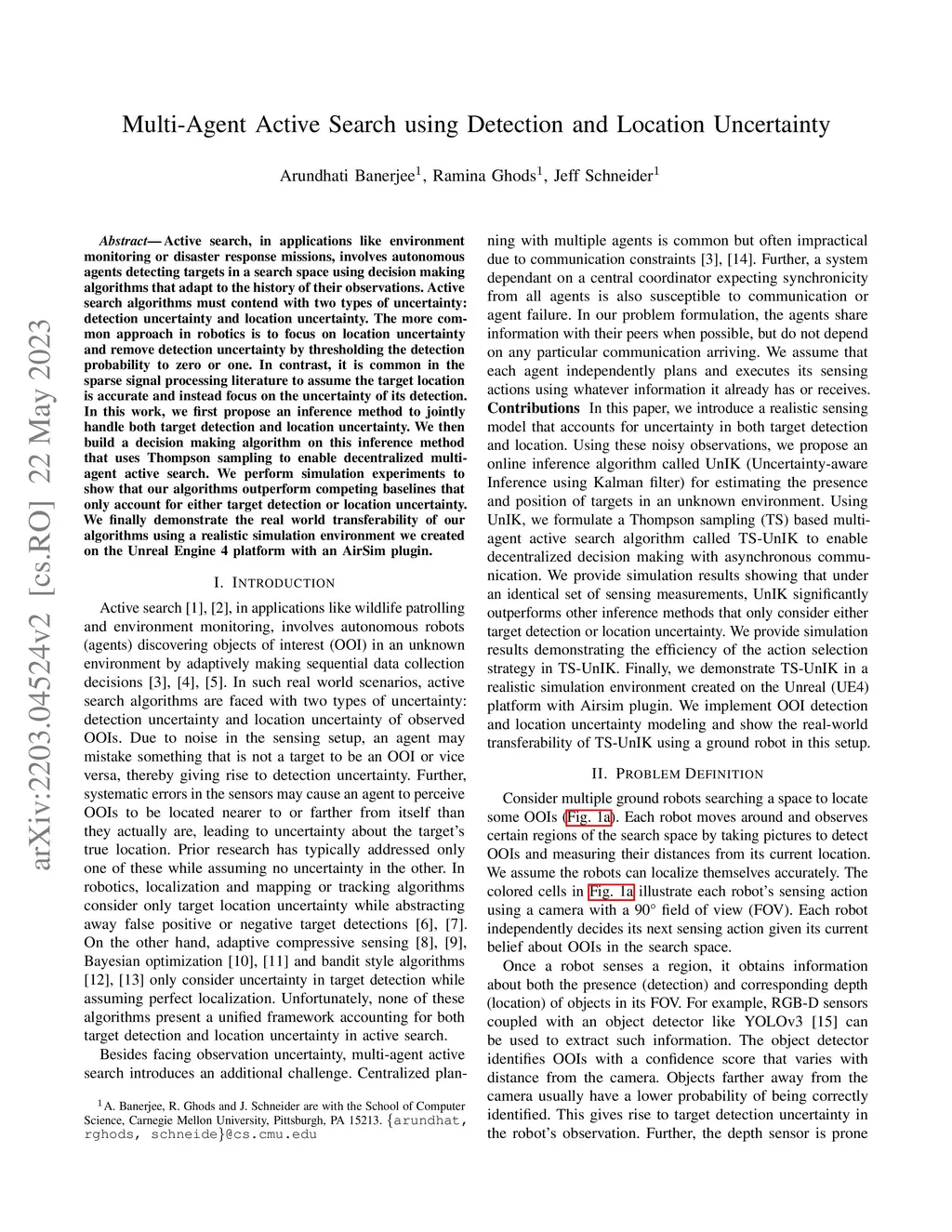 Active search, in applications like environment monitoring or disaster response missions, involves autonomous agents detecting targets in a search space using decision making algorithms that adapt to the history of their observations. Active search algorithms must contend with two types of uncertainty: detection uncertainty and location uncertainty. The more common approach in robotics is to focus on location uncertainty and remove detection uncertainty by thresholding the detection probability to zero or one. In contrast, it is common in the sparse signal processing literature to assume the target location is accurate and instead focus on the uncertainty of its detection. In this work, we first propose an inference method to jointly handle both target detection and location uncertainty. We then build a decision making algorithm on this inference method that uses Thompson sampling to enable decentralized multi-agent active search. We perform simulation experiments to show that our algorithms outperform competing baselines that only account for either target detection or location uncertainty. We finally demonstrate the real world transferability of our algorithms using a realistic simulation environment we created on the Unreal Engine 4 platform with an AirSim plugin.